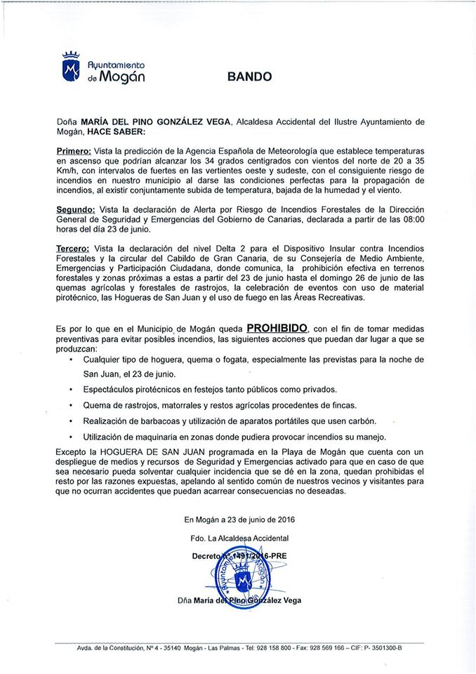 Informamos a todos los ciudadanos que queda prohibida, con el fin de tomar medidas preventivas para evitar posibles incendios, cualquier tipo de hoguera, quema o fogata, realización de barbacoas, espectáculos pirotécnicos y quema de rastrojos, matorrales y restos agrícolas.