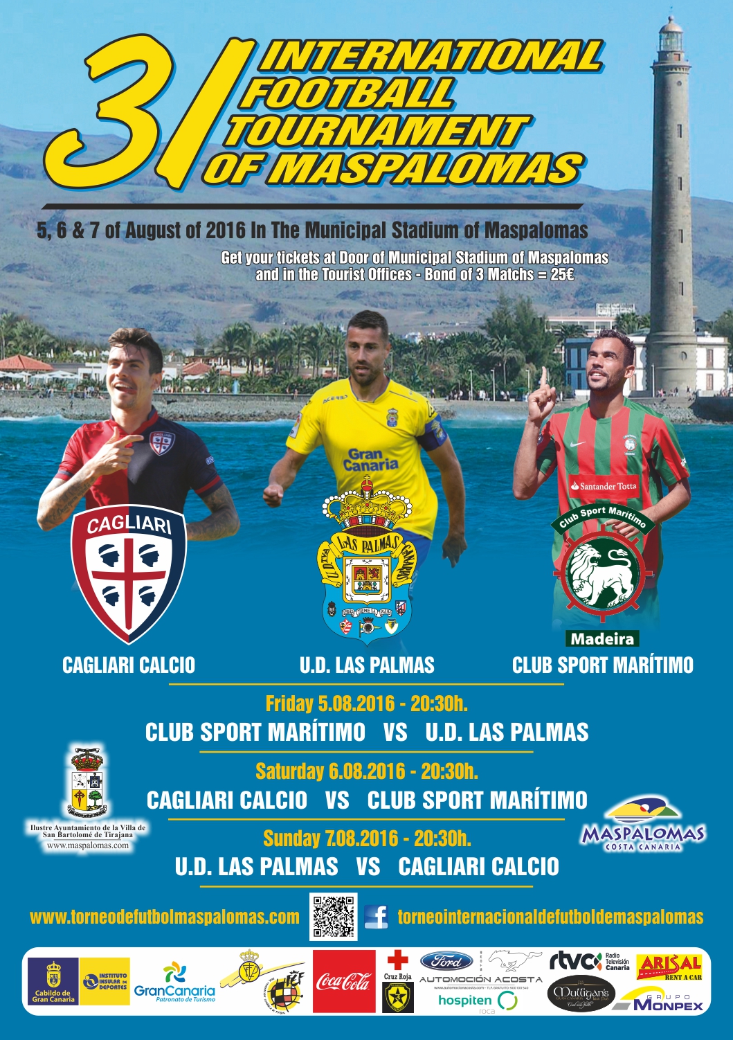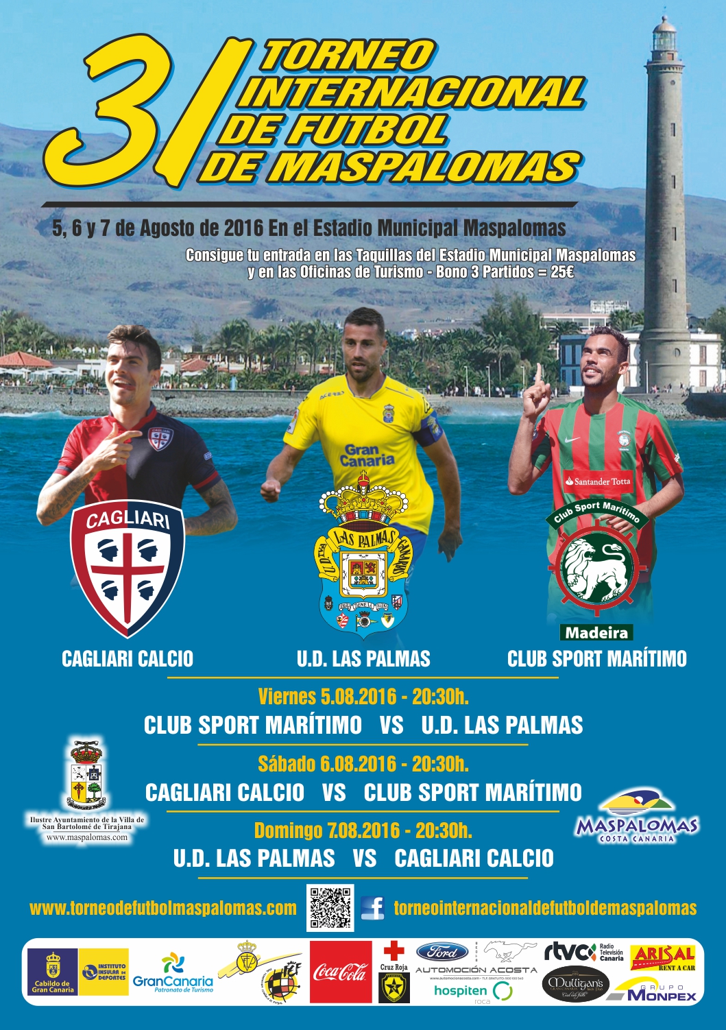 El 31º Torneo Internacional de Fútbol de Maspalomas entra ya en fase de cuenta atrás. El certamen de ámbito triangular, presentado recientemente por el alcalde de San Bartolomé de Tirajana, Marco Aurelio Pérez, tiene fijadas como fechas de celebración las de los días 5, 6 y 7 de agosto en el escenario del Estadio de Maspalomas. Los equipos participantes son la Unión Deportiva Las Palmas, Club Sport Marítimo de Funchal y Cagliari Calcio, todos de la máxima categoría de sus campeonatos ligueros.