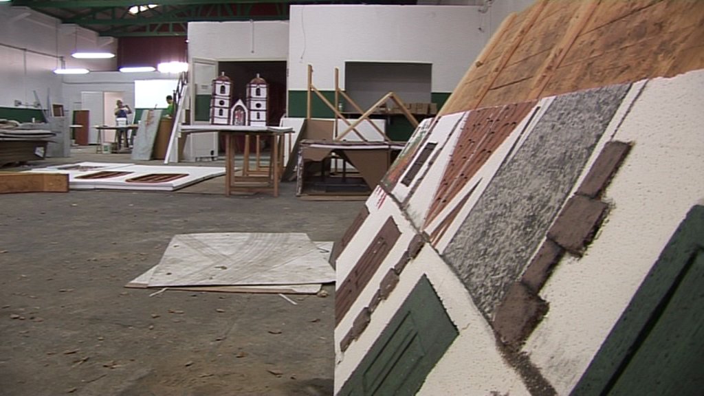 En total se están construyendo cinco fachadas divididas en partes que serán después ensambladas en el Centro Cívico de Carrizal. Todo el decorado está siendo realizado con poliestireno expandido y cartón reciclado, tal y como informaba esta mañana el responsable de la escenografía, Gregorio Ruano.