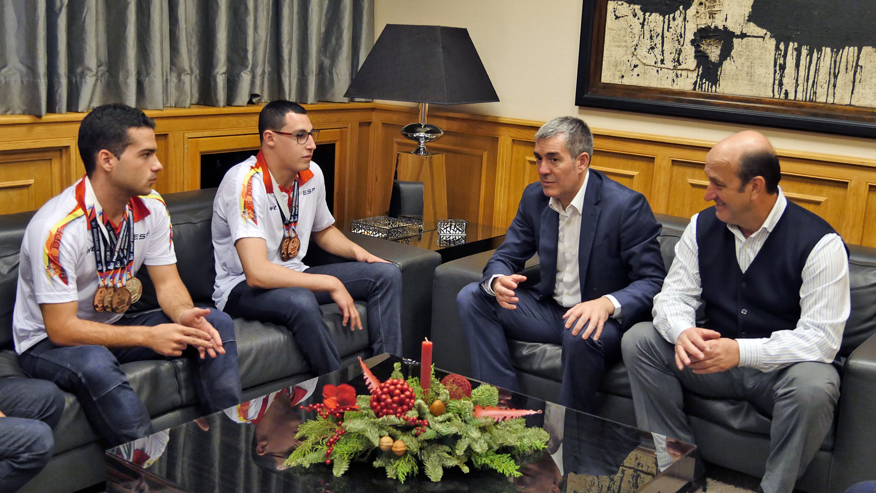 El presidente del Gobierno de Canarias, Fernando Clavijo, y el director general de Deportes, José Francisco Pérez, han recibido hoy, en la sede de Presidencia del Gobierno en Las Palmas de Gran Canaria, a los nadadores canarios Adrián Santana y Alejandro Meneses tras los resultados obtenidos en el Campeonato del Mundo INAS, (Federación Internacional de Deportes para Personas con Discapacidad Intelectual) que se celebró en a ciudad mejicana de Aguascalientes del 27 de noviembre al 4 de diciembre de 2017.