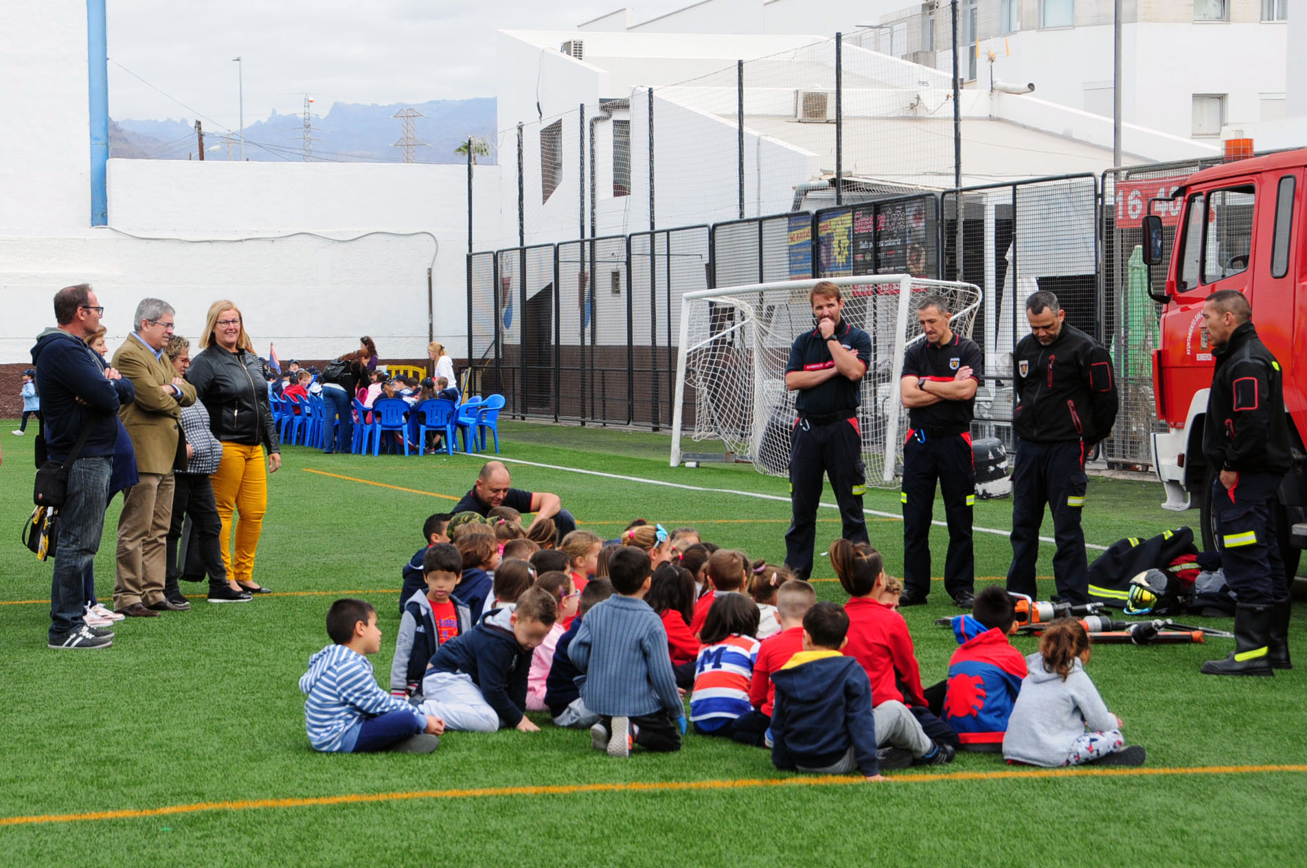 El terreno de juego de El Tablero fue sectorizado y señalizado para diferentes actividades, de tal forma que se formaron diversos grupos que realizaban actividades distintas, para ir alternando luego en su desarrollo. Fichas con señalética e instrucciones básicos, karts a pedales para circular por un circuito marcado con conos e hinchables compaginaron adquisición de conocimientos y desarrollo lúdico. En la otra, miembros de Policía Local y Cuerpo de Bomberos de San Bartolomé de Tirajana adiestraron a los niños acerca de normas básicas de auxilio, y de cómo actuar en situaciones de emergencia, fundamentalmente en el ámbito de incidentes caseros y avisos al 1-1-2.