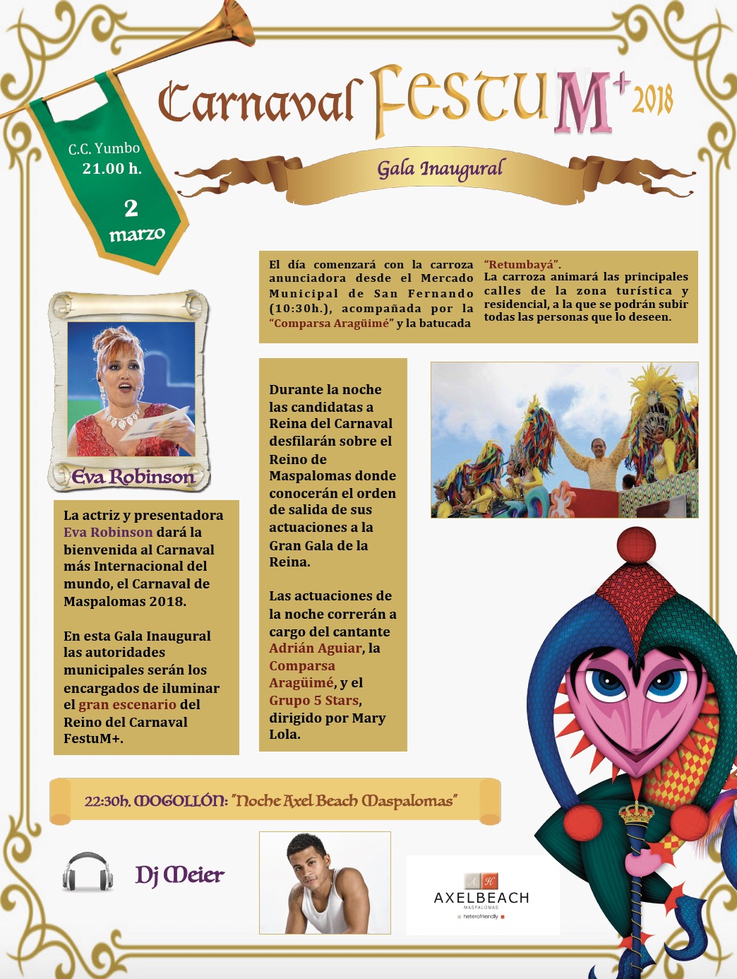 El Carnaval Internacional de Maspalomas 2018 arranca este viernes, 2 de marzo, a las 21.00 horas, con el Encendido del Escenario, su gran fiesta medieval FestuM+ que se desarrollará hasta el próximo 11 de marzo.