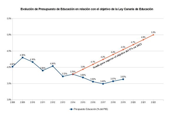 - Aunque aparentemente el presupuesto crece –como dice el gobierno-, ese crecimiento es bajo y ridículo respecto al PIB. Cuando se aprueba la Ley Canaria de Educación en 2014, el presupuesto de educación representaba el 3,79% del PIB. Cuando se agote esta legislatura estaremos en el 3,63%. Es decir, bajaremos en estos 5 años un 0,16% respecto al PIB.
