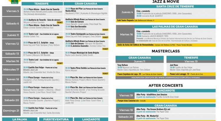 Serán cerca de 50 conciertos bajo una marca, Festival Internacional Canarias Jazz & Más Heineken, que cumple un año más gracias a la colaboración de los municipios de Santa Cruz de Tenerife, San Cristóbal de La Laguna, Adeje, Puerto de la Cruz, Las Palmas de Gran Canaria, Santa Brígida, Puerto del Rosario, y Los Llanos de Aridane, y el patrocinio del Gobierno de Canarias y los Cabildos de Gran Canaria, Tenerife, La Palma, Fuerteventura y Lanzarote, Casa África, Auditorio de Tenerife Adán Martín, Fundación Auditorio y Teatro de Las Palmas de Gran Canaria, Teatro Leal y Teatro Guiniguada. Organizado por Colorado Producciones, cuenta una edición más con el patrocinio de la firma Heineken.