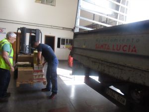 Trabajadores del Almacén Municipal trasladaron hasta la nave del Banco de Alimentos en el polígono de Arinaga los productos recogidos en la carrera de obstáculos celebrada el pasado sábado 6 de julio en la Avenida de Canarias, que fue organizada por la concejalía de Igualdad dentro de los actos de la Semana LGTBI. Los participantes en la carrera aportaron productos como leche, arroz, cereales y lentejas. Un supermercado de Vecindario también colaboró en esta acción solidaria.