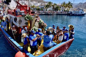 Marineros, residentes y visitantes se unieron a este evento que comenzó con la eucaristía en la plaza Doctor Pedro Betancor León de Playa de Mogán y el recorrido  hasta la Cofradía de Pescadores en el Puerto junto a una Virgen del Carmen rodeada de flores blancas, rojas y amarillas que más tarde presidió la procesión marítima a bordo del buque ‘Nuevo Calipso’.