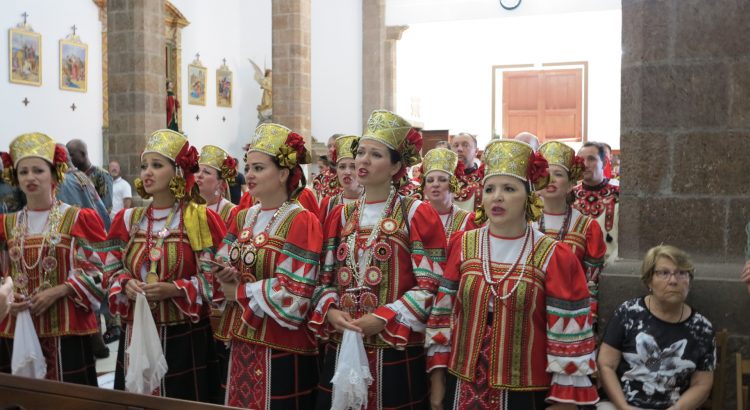 Los diferentes grupos folclóricos pertenecientes a Rusia, Benín, Madrid, Italia, Senegal y Canarias acudieron ataviados con la vestimenta típica de sus respectivos países y realizaron durante el transcurso de la homilía sus ofrendas musicales a la Virgen. Antes de iniciarse la ceremonia religiosa el grupo Belogorie de Rusia cantó un imponente réquiem coral para luego dar paso a las palabras de bienvenida de Jesús Vega.
