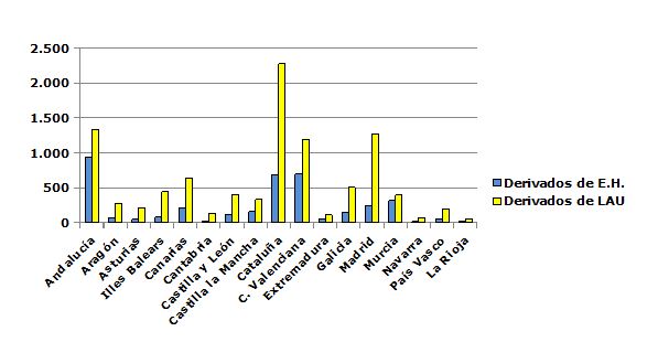 Atendiendo solo a los lanzamientos consecuencia de procedimientos derivados de la LAU, en el primer lugar aparece también Cataluña, con 2.281, el 23,3 por ciento del total; seguida por Andalucía, con 1.336; Madrid, con 1.269; y la Comunidad Valenciana, con 1.194. En cuanto a los derivados de ejecuciones hipotecarias, la clasificación la encabeza Andalucía, con 934; seguida por la Comunidad Valenciana, con 694; Cataluña, 689; y Murcia, 311.