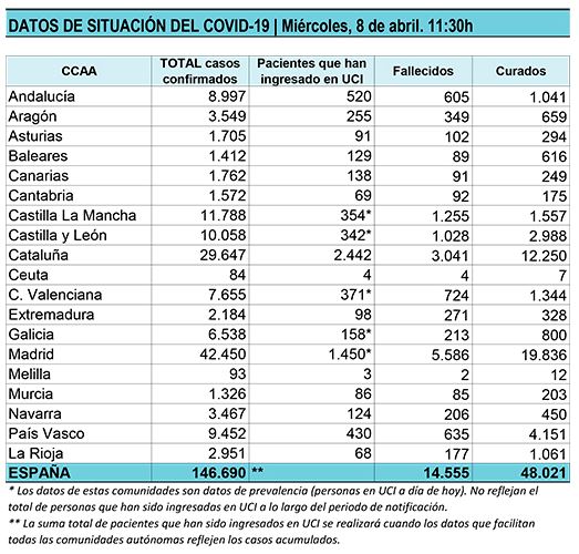Tras la entrada en vigor del Estado de Alarma decretado para contener la expansión del COVID-19, la actualización de los datos de situación se comunica una vez al día, a las 11:30h, por parte del Ministerio de Sanidad.