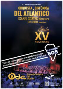 La Orquesta Sinfónica Del Atlántico celebra sus 15 años de andadura con un concierto, en coproducción con la Fundación Auditorio y Teatro de Las Palmas de Gran Canaria, y con el apoyo del Ayuntamiento de Las Palmas y el Gobierno de Canarias. Ambas instituciones han decidido destinar la recaudación íntegra de esta función, que tendrá lugar el día 1 de noviembre a las 19:00 horas en la Sala Sinfónica del Auditorio Alfredo Kraus, a los damnificados por el volcán de la isla de La Palma, isla en la que tiene sus orígenes la Orquesta Sinfónica Del Altántico. En concreto, la taquilla se ingresará en la cuenta que el Ayuntamiento de Los Llanos de Aridane tiene habilitada para ayudar a los afectados por la erupción volcánica.