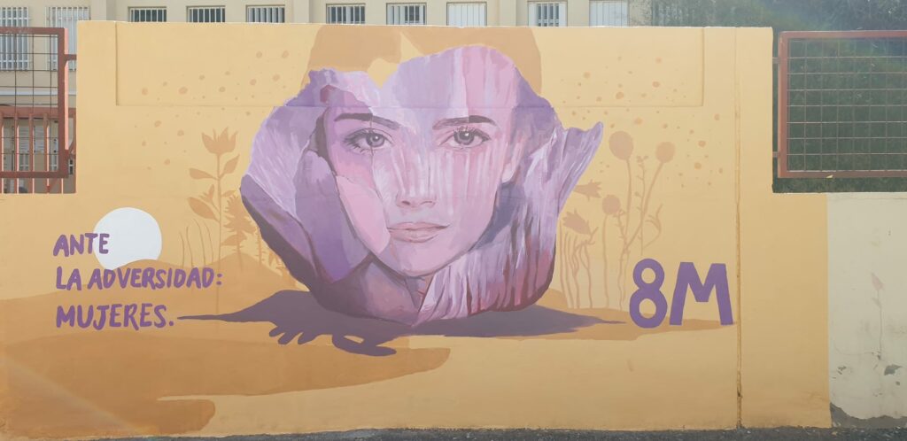 Lucía, Selena, Ulises y David nunca habían participado en la elaboración de un mural, y gracias a la ayuda de la artista visual Irene León se pusieron manos a la obra. La propuesta la hicieron la Asociación de Mujeres Liluva y la concejalía de Igualdad del Ayuntamiento de Santa Lucía de Tirajana, y el resultado se puede ver desde este 8 de marzo en la facha del instituto: un gran rostro de mujer pintado con pintura morada, con unos ojos con brillo en la mirada y a frase ‘Ante la adversidad: mujeres. 8 M’.