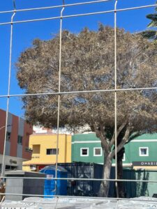 Es visible a simple vista el estado en el que se encuentra este ejemplar, las hojas han perdido su color verde, provocado probablemente por la falta de riego o por alguna otra cuestión que pudiera estar relacionada con la ejecución de las obras.