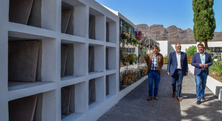 El alcalde de Santa Lucía de Tirajana, Francisco García, visitó este martes el cementerio acompañado del concejal del área, Sergio Vega y del primer teniente de alcalde, Santiago Rodríguez. El primer edil manifestó que “este es el único cementerio municipal que se construyó en la época de la República, y esta reforma era muy demandada por nuestra ciudadanía”. El concejal de Cementerios y de la zona alta, Sergio Vega, manifestó que “esta era una obra necesaria porque ya estábamos escasos de nichos y, además, hemos aprovechado para mejorar los accesos al cementerio”. El primer teniente alcalde, Santiago Rodríguez, destacó que “hoy recepcionamos estas obras que suponen una mejora en el acceso y en el número de nichos”.