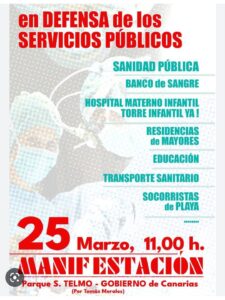 Por un Banco de Sangre 100X100 público, por la Torre infantil del Hospital Materno Infantil, por la recuperación de la gestión pública de los Centros de Mayores, por una sanidad y unos servicios públicos de calidad. Convocamos a todo el pueblo canario que sufre esta situación a sumarse el sábado 25 de marzo a las 11.00 h. en el Parque de San Telmo para salir en manifestación en dirección a la Presidencia del Gobierno de Canarias.
