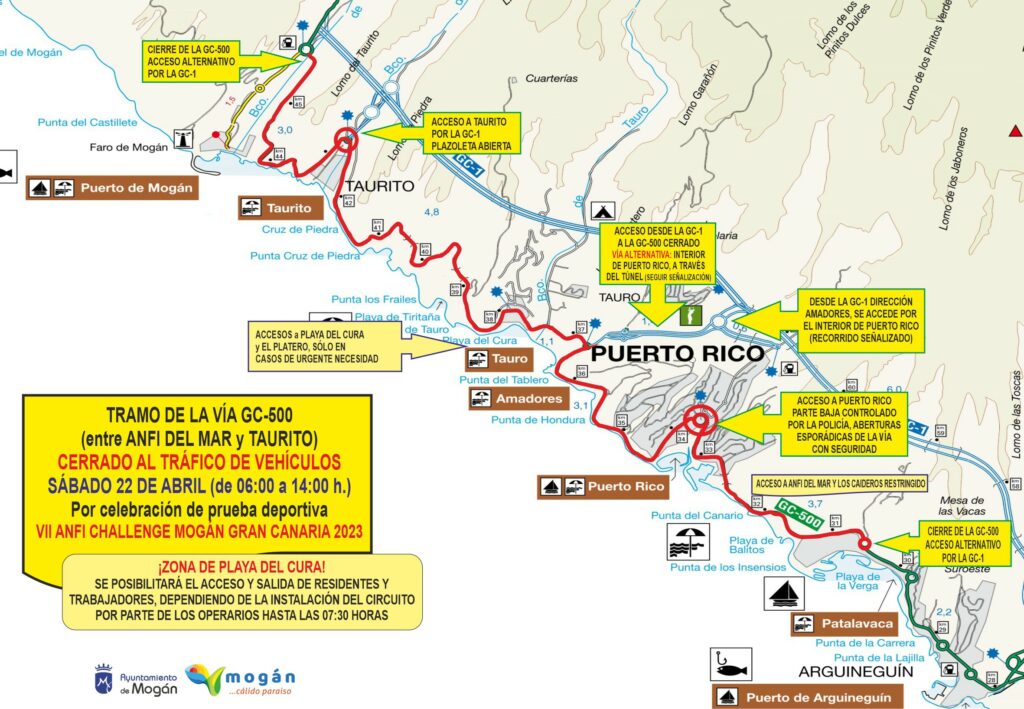 Los cortes y restricciones se producirán entre las 06:00 y las 14:00 horas del sábado 22 de abril con motivo de la celebración de la prueba de triatlón Anfi Challenge Mogán Gran Canaria. La carretera GC-500 se encontrará cerrada al tráfico de vehículos entre la plazoleta del barranco de La Verga –Zona de Anfi del Mar, punto kilométrico 30+700– y el barranco de Taurito, punto kilométrico 42+800.
