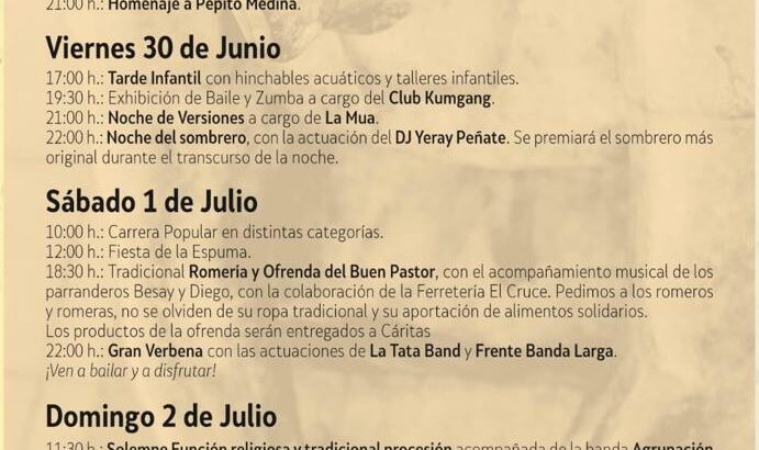 El sábado a las 10 de la mañana será la carrera popular. A las 12 la fiesta de la espuma. Por la tarde, a las 18.30, será la Romería y Ofrenda del Buen Pastor, con el acompañamiento musical de los parranderos Besay y Diego. Se trata de una romería solidaria, se recogerá alimentos que serán entregados a Cáritas. Después, a las 10 de la noche, comenzará la verbena con La Tata Band y Frente Banda Larga.