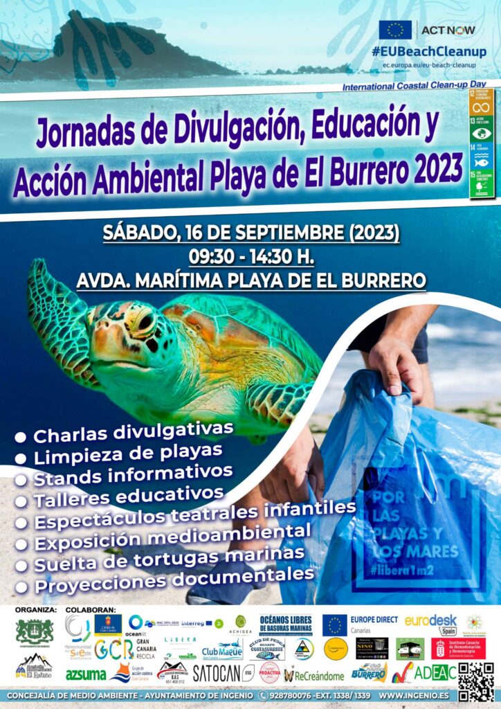Una nueva edición de las Jornadas de Divulgación, Educación y Acción Ambiental ‘Playa de El Burrero’ se celebrarán este sábado, 16 de septiembre, organizadas por el Ayuntamiento de Ingenio a través de la Concejalía de Medio Ambiente y Playas, con el objetivo de fomentar la sensibilización y concienciación ambiental. De 09:30 a 14:30 horas, además de poder visitar los stands informativos de diversas asociaciones y colectivos participantes, se desarrollarán charlas de divulgación ambiental, limpieza de playa, talleres educativos, espectáculos infantiles teatrales de Cancionero Isleño, proyecciones audiovisuales medioambientales, exposiciones y un acto de liberación de tortugas marinas recuperadas, entre otras actividades.