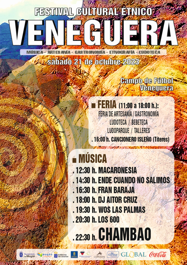El barrio de Veneguera volverá a reunir el próximo sábado 21 de septiembre actividades de ocio, cultura y etnografía para toda la familia, además de feria de artesanía, zona gastronómica y conciertos de artistas y grupos del archipiélago como Macaronesia, Fran Baraja, Wos Las Palmas, Aitor Cruz y Los 600. Protagoniza el cartel del Festival la reconocida banda de ‘flamenco chill’ Chambao, que está celebrando su regreso con nuevo trabajo tras un lustro de descanso.