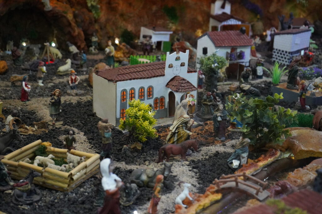 La azotea de Alejandro Ruano recibe a las personas que tienen el privilegio de visitarla con el resultado de más de dos meses de trabajo, que no es otro que el Belén, que consta de tres niveles de altura conectados entre sí y al que no le falta detalle gracias a las más tres 300 figuras que lo componen. Un largo río, cascadas, un mercado de abastos así como oficios ganaderos y agrícolas son algunas de las representaciones que se pueden observar, pero sin duda llaman la atención edificaciones que cualquier vecino y vecina del municipio llegaría a reconocer, como el Molino de Viento que se encuentra a pocos metros del casco histórico, o la Iglesia de Nuestra Señora del Carmen de Arguineguín. Por supuesto, el Nacimiento tiene su protagonismo con la Virgen María, José y el Niño Jesús adorado por los Reyes Magos de Oriente.