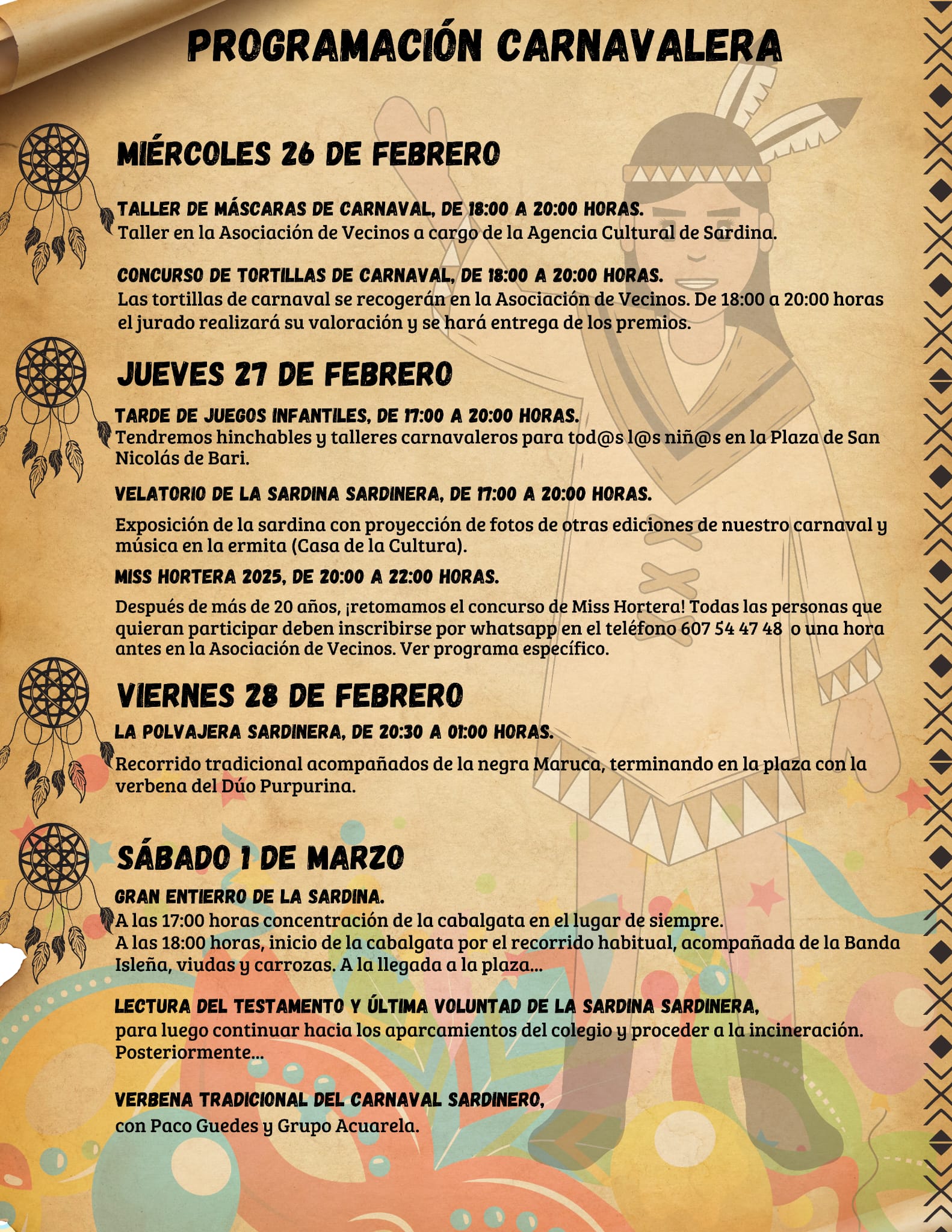 Santa Lucía de Tirajana, 20 febrero 2025.- Sardina del Sur comienza este sábado 22 de febrero su Carnaval dedicado al Lejano Oeste con el Pasacalles anunciador a partir de las 11 de la mañana. El mismo sábado a partir de las 20.30 será la Trans-Sardina, una carrera popular con disfraces. En el programa de las carnestolendas también está previsto un concurso de tortillas de carnaval, baile de mayores, taller de máscaras o velatorio de la sardina.