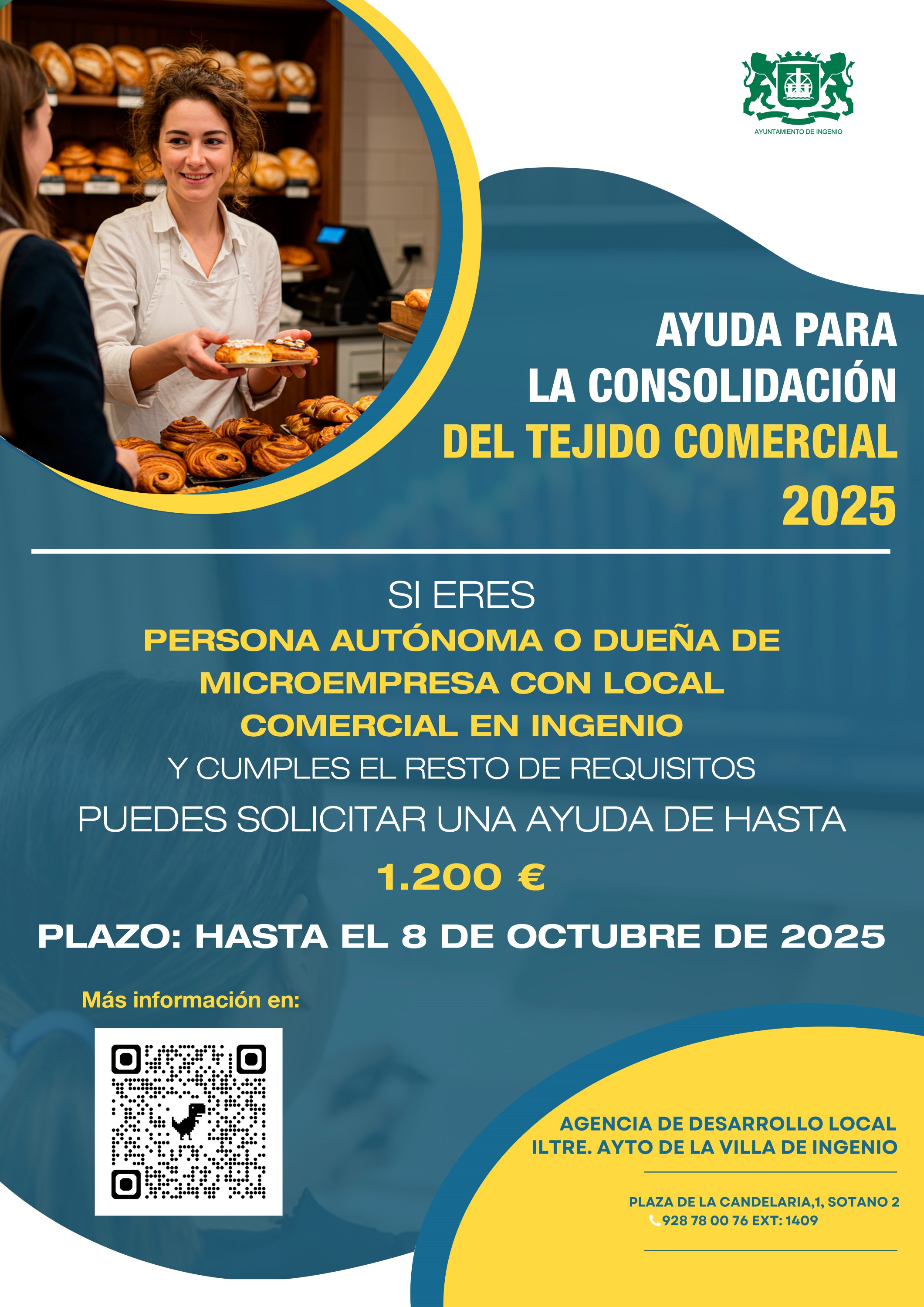En este sentido, este miércoles, 17 de septiembre, se ha publicado en el BOP Las Palmas el ‘Extracto de la Resolución de Alcaldía por la que se aprueban las Bases reguladoras y Convocatoria de Subvenciones destinadas a Personas Trabajadoras Autónomos y Empresas del municipio de Ingenio, para el Mantenimiento y Consolidación del Tejido Comercial, anualidad 2025’. Podrán ser beneficiarias personas trabajadoras autónomas y microempresas que tenga la actividad económica en el municipio de Ingenio, desarrollando una de las actividades recogidas en las bases, a fin de mantener y dinamizar la actividad económica en el municipio y promover el comercio y el empleo local, tal y como ha resaltado la alcaldesa y concejala de Desarrollo Local y Empleo Vanesa Martín. “Un año más seguimos apostando y apoyando a las personas autónomas y al pequeño comercio. Desde la Agencia de Desarrollo Local lanzamos esta convocatoria de subvenciones que se publicaron hoy en el BOP por lo que mañana empieza el plazo de solicitudes hasta el 8 de octubre,” anunciaba.