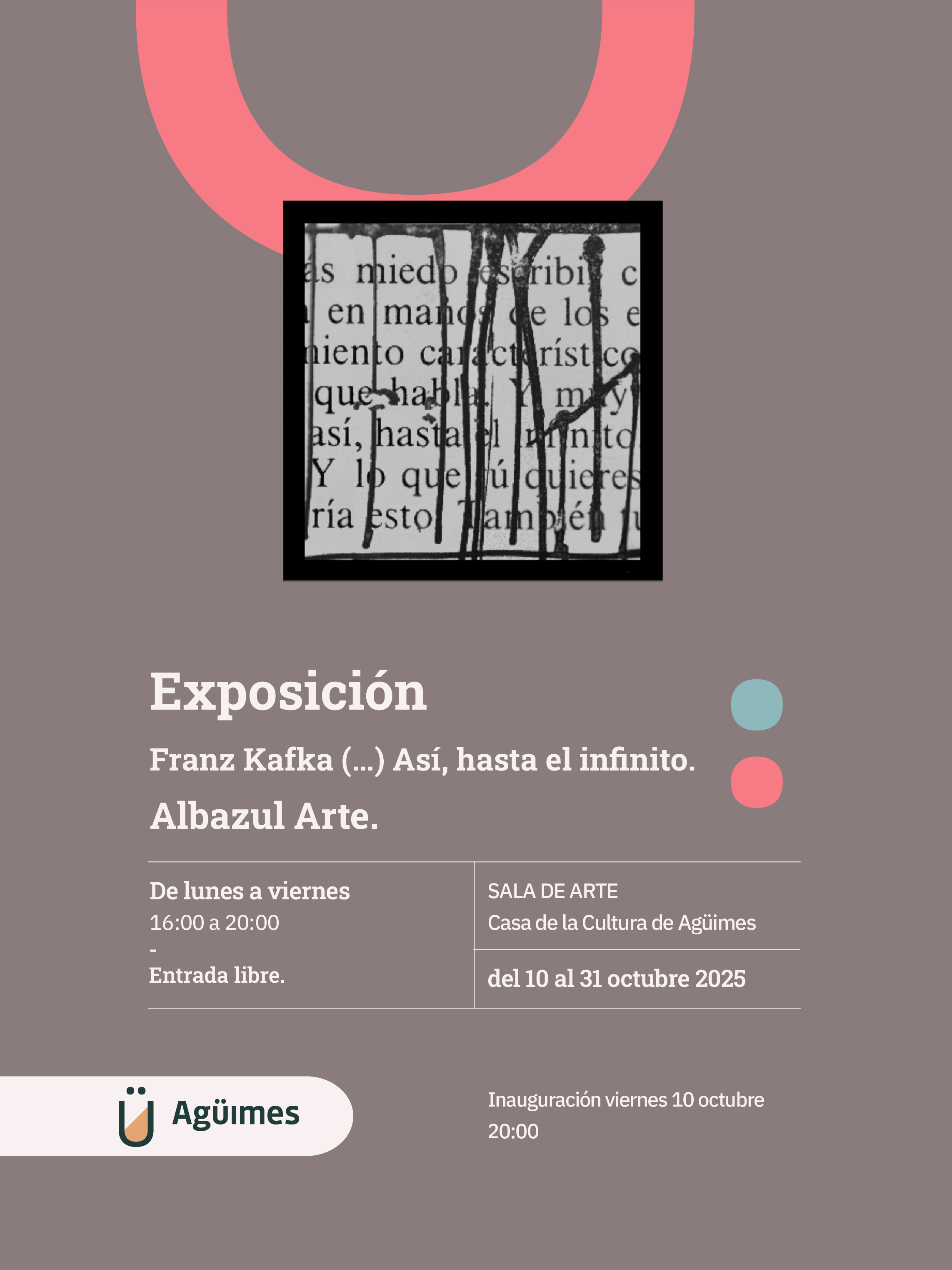 Tras dos años de intenso trabajo, el colectivo Albazul Arte presenta su tercera exposición como grupo: ‘Franz Kafka (…) así, hasta el infinito’. La muestra, que versa sobre la figura del insigne escritor checo, se inaugurará el próximo viernes 10 de octubre, a las 20:00, en la Sala de Arte Agüimes, ubicada en la Casa de la Cultura del casco. Estará abierta al público hasta el 31 de octubre de lunes a viernes, de 16:00 a 20:00 horas.