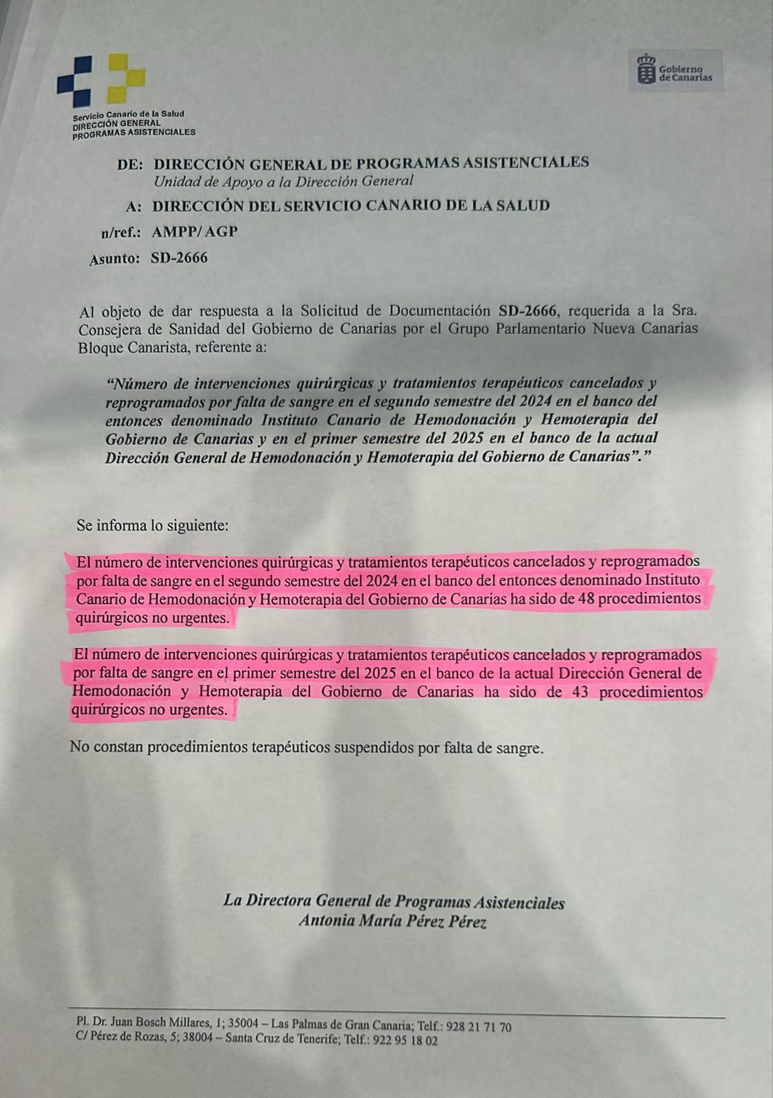 La propuesta de Caraballo, añadió, busca superar una realidad que obliga a los hematólogos, como indicó, a reprogramar cirugías por “falta de reservas”. El último informe facilitado por el Gobierno al grupo de NC-BC, recoge 91 intervenciones reprogramadas. Caraballo afirmó además que Canarias registra 27,8 donaciones por cada 1.000 habitantes, una cifra inferior a la media estatal y a comunidades como Extremadura (48) o Andalucía (32).