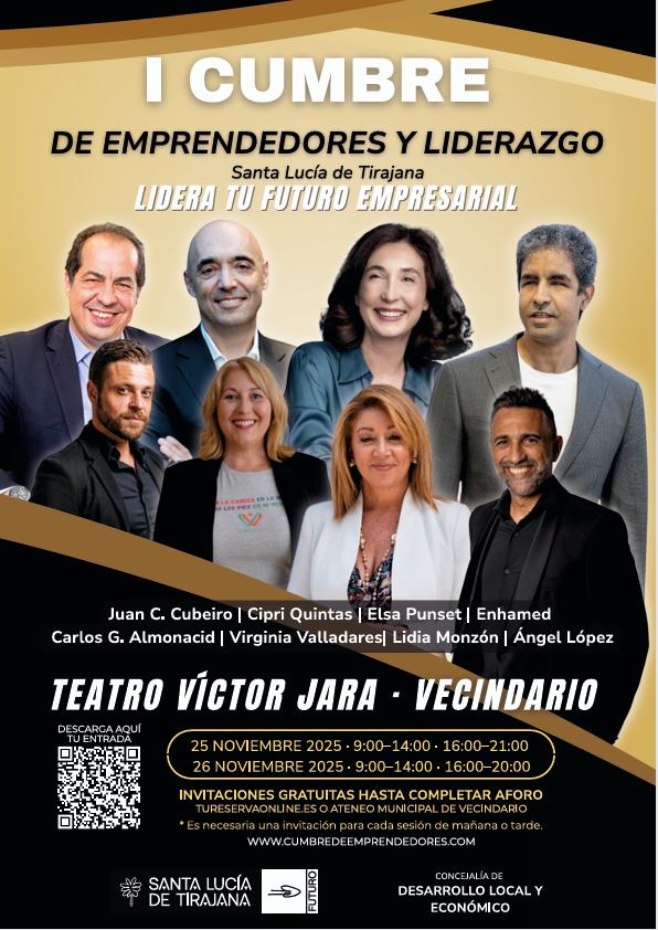 Santa Lucía de Tirajana 17 de noviembre 2025.- El teatro Víctor Jara acogerá los próximos martes 25 y miércoles 26 de noviembre la I Cumbre de Emprendedores y Liderazgo. La escritora y divulgadora Elsa Punset, el deportista y conferenciante Enhamed Enhamed, el experto en motivación Carlos Almonacid y la consultora digital Virginia Valladares serán algunos de los ponentes. La entrada a la cumbre es gratuita aunque hay que retirar las invitaciones en el Ateneo Municipal o en www.tureservaonline.es