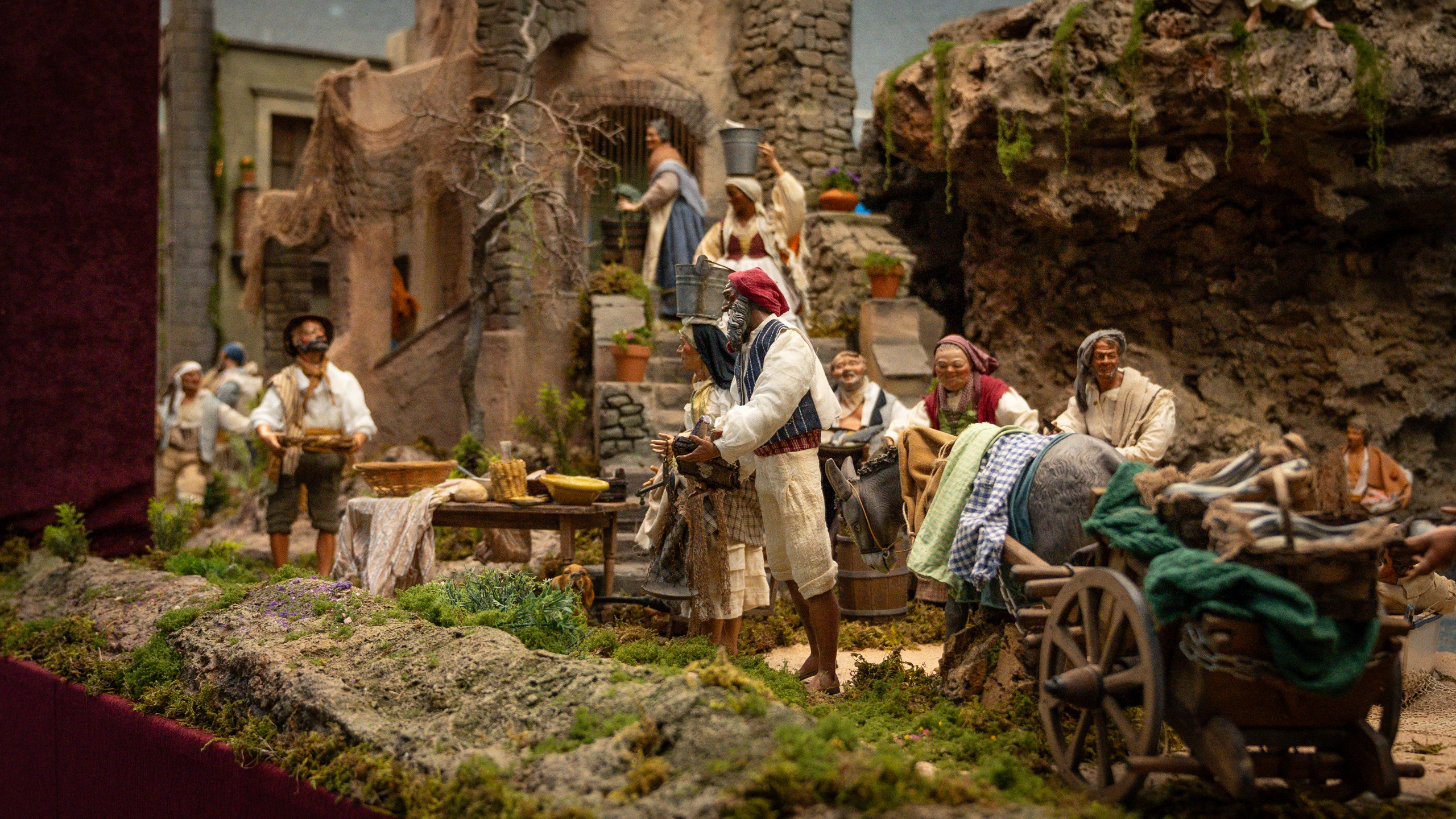 En este nacimiento, el visitante puede contemplar las diferentes escenas históricas asociadas a los enclaves costeros del archipiélago como barquillas varadas rebosantes de pescado, pescadoras que se acercan a la playa para llenar sus cestas y bañeras para venderlos en ciudad. Ancianas y muchachas remendando las redes y pescadores y marineros sacando el chinchorro y trasmallos con la alegría de una buena faena. En medio de esta vida cotidiana se representa el nacimiento del niño Jesús en una gruta cerca de la playa.