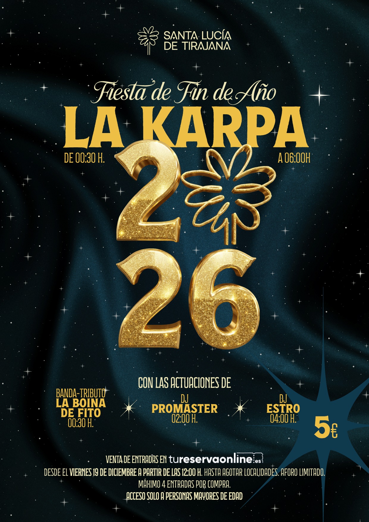Santa Lucía de Tirajana 17   diciembre 2025.-    El Ayuntamiento de Santa Lucía de Tirajana pone a la venta a partir de este viernes 19 de diciembre las entradas para “La Fiesta de Fin de Año de La Karpa”. A partir de las 12:00 horas, con un precio único de 5 euros.  Las entradas podrán adquirirse a través de la plataforma tureservaonline.es, hasta agotar localidades. El acceso a la fiesta es para mayores de 18 años.