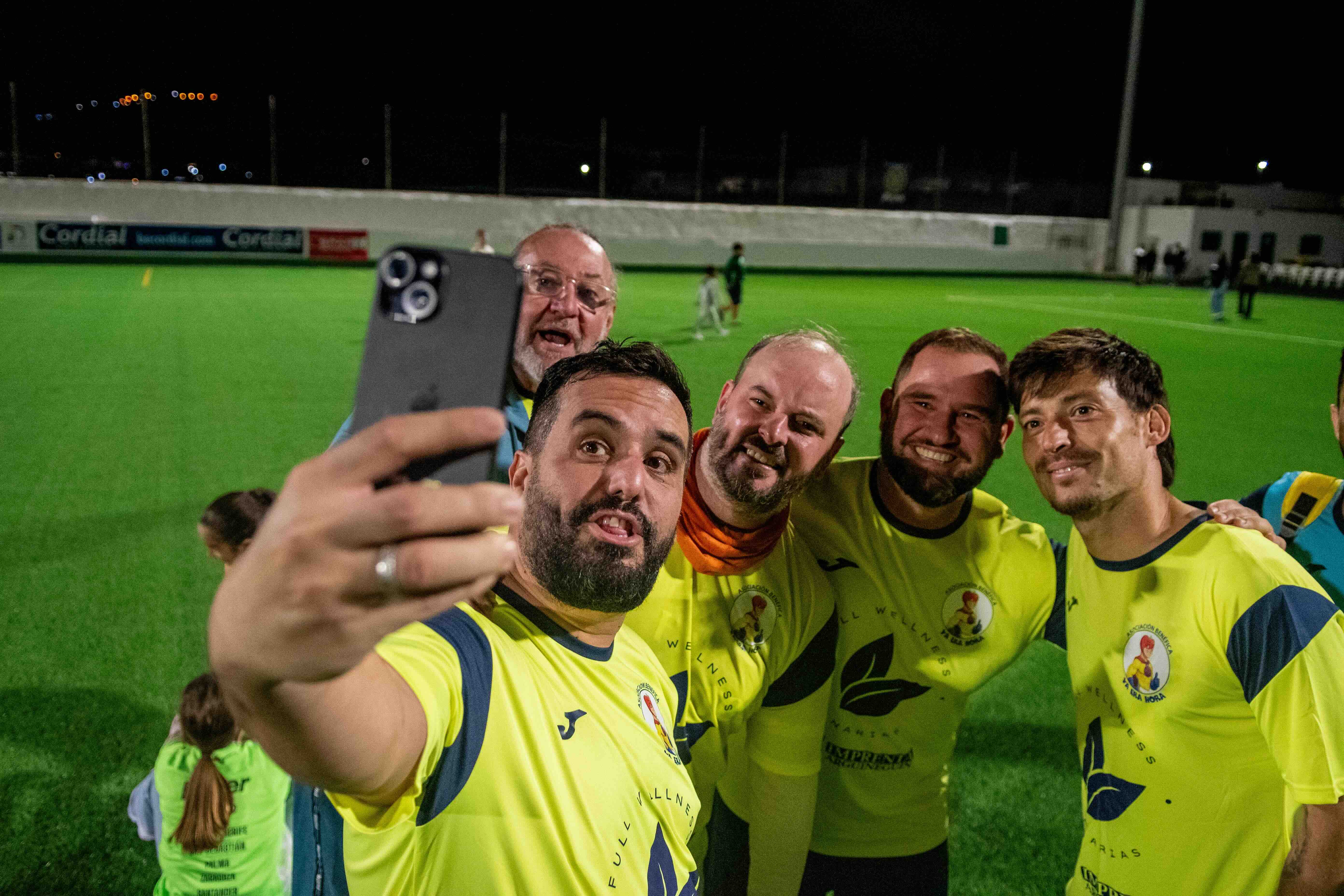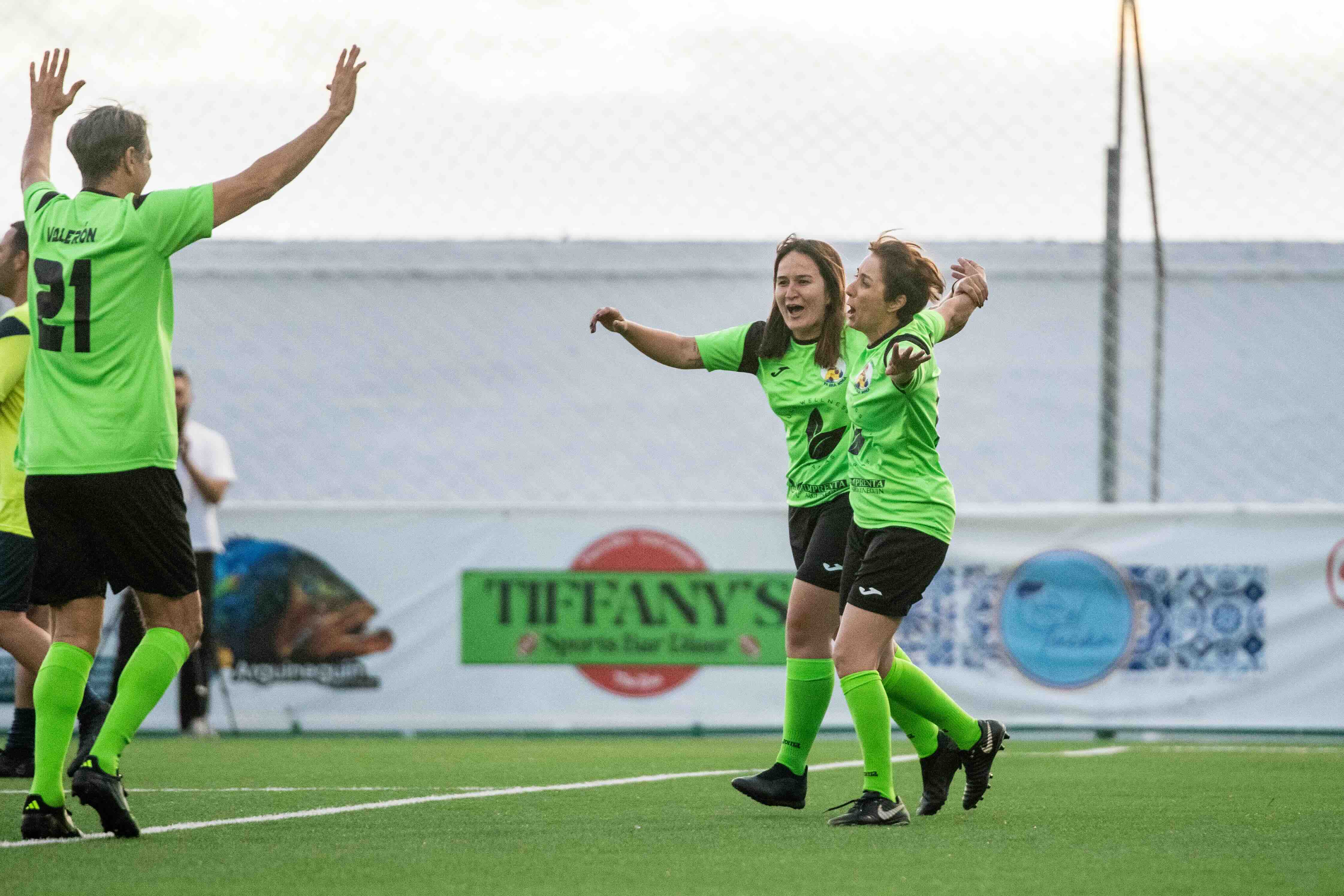 El partido enfrentó a dos equipos llenos de caras conocidas, encabezados por personalidades que se entregaron en el campo con energía y entusiasmo. El de color verde, capitaneado por Emily Quintana –para la ocasión, Emily Putellas– se denominó Benéficos Descoordinados CF y contó entre sus filas con todo un símbolo del fútbol canario y ex internacional español, Juan Carlos Valerón, “El Mago de Arguineguín”. Pero también con la alcaldesa de Mogán, Onalia Bueno, que demostró que la actitud a veces vale más que la maña y llegó a marcar dos tantos. Entre estos, el primero del partido.