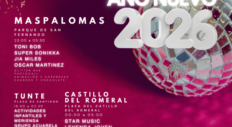 Maspalomas acogerá la celebración en el Parque de San Fernando, desde las 23:00 hasta las 05:00 horas, con las actuaciones de Toni Bob, Super Sonikka, Jia Miles y Óscar Martínez. El espacio contará además con animación, photocall, glitter bar y servicio de churros y chocolate. En Castillo del Romeral, la celebración tendrá lugar en la plaza del pueblo, entre las 00:00 y las 05:00 horas, con las actuaciones de Star Music, Leyenda Joven y Grupo Mallombe, y acceso libre para el público. Por su parte, en Tunte, la programación comenzará a las 18:00 horas en la Plaza de Santiago con merienda y actividades infantiles, y se prolongará hasta las 02:30 horas con las actuaciones del Grupo Acuarela, Línea DJ y D Music.