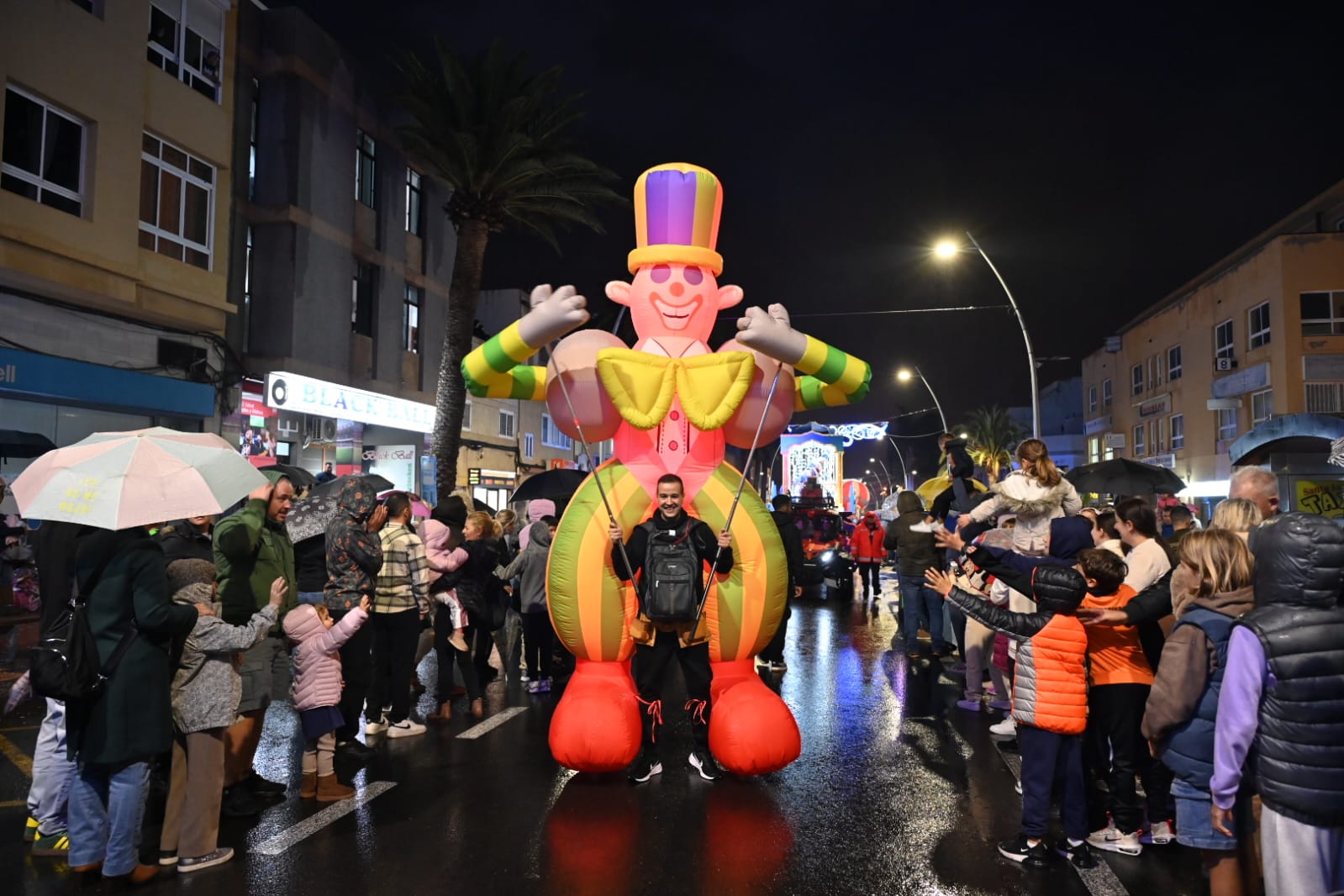 La Cabalgata de Reyes organizada por el Ayuntamiento de Santa Lucía de Tirajana contó un año más con la participación de más de un centenar de voluntarios y voluntarias del Taller de Animación municipal, que tenían previsto acompañar a las carrozas pero al final no pudieron hacerlo ya que desde el inicio, sobre las 18 horas, comenzó a llover y ha estado lloviendo durante todo el recorrido.