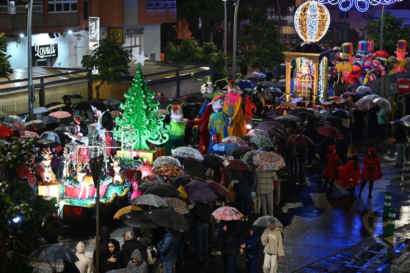 El tren de la ilusión abrió la comitiva seguido de seis carrozas, y la mayoría de la veintena de muñecos gigantes y marionetas pudieron acompañar a Sus Majestades los Reyes de Oriente desde el Cruce de Sardina hasta el teatro Víctor Jara. Lo que sí se suspendió fue la participación de varios cientos de niños y niñas que tenían previsto acompañar a las carrozas bailando durante todo el recorrido, por razones de seguridad no pudieron hacerlo.