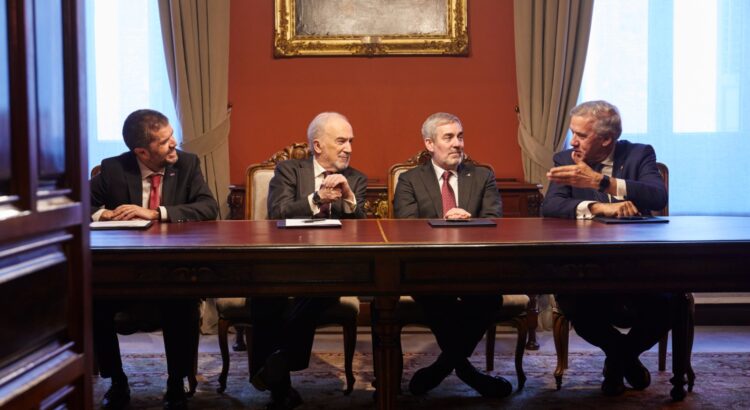 El presidente de Fernando Clavijo junto a los rectores de las Universidad de La Laguna y de las Palmas de Gran Canaria, Francisco García y Lluís Serra, han firmado, esta mañana, con el director de la Real Academia Española (RAE), Santiago Muñoz Machado, una declaración de intenciones con la que se consolidará la relación de la Comunidad Autónoma de Canarias con la Real Academia Española. El Gobierno forma parte, desde el 29 de enero de 2025, del patronato de la Fundación pro Real Academia Española.