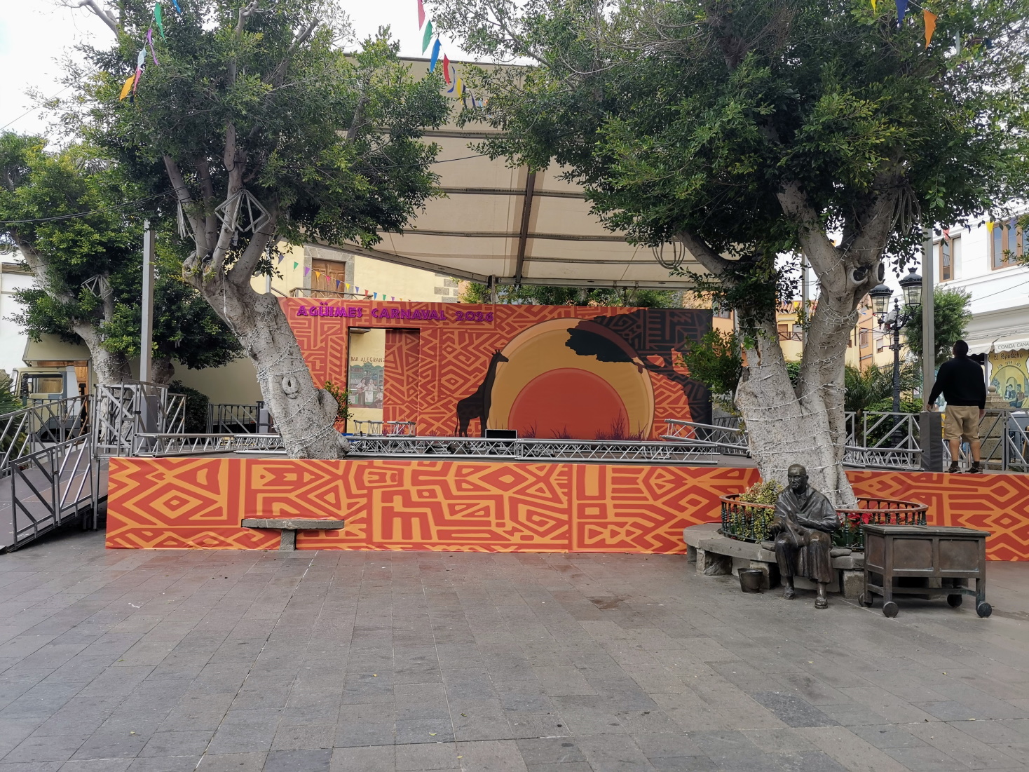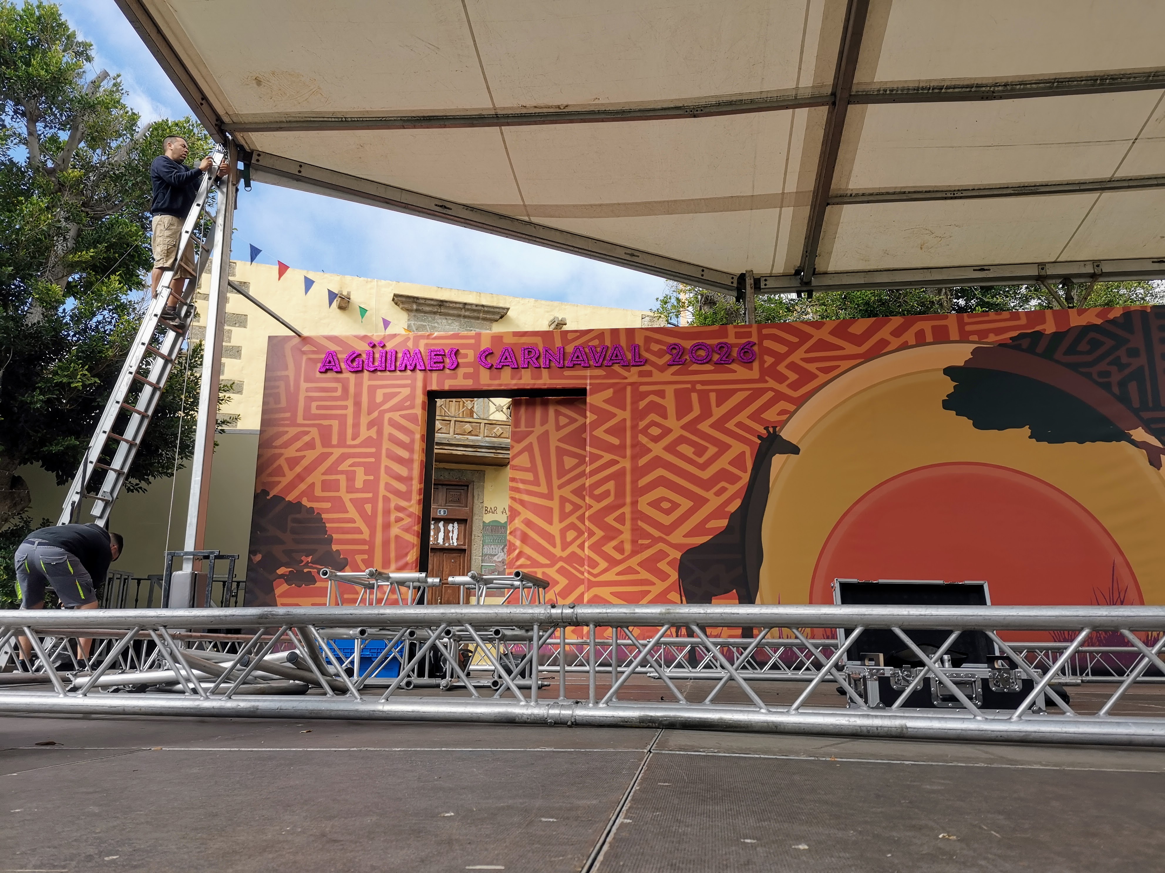 El Ayuntamiento de Agüimes ultima los últimos detalles para convertir la plaza del Rosario del casco histórico en una estampa africana de cara al Carnaval 2026 que, bajo la alegoría ‘África, un continente de colores’, se celebrará durante todo el mes de febrero. El escenario, de unos 11 metros de ancho por 4 de alto, y varios pórticos decorados con motivos que recuerdan al continente vecino convierten la plaza en un auténtico safari de color y alegría que invitan a disfrutar de estas fiestas por todo lo alto.