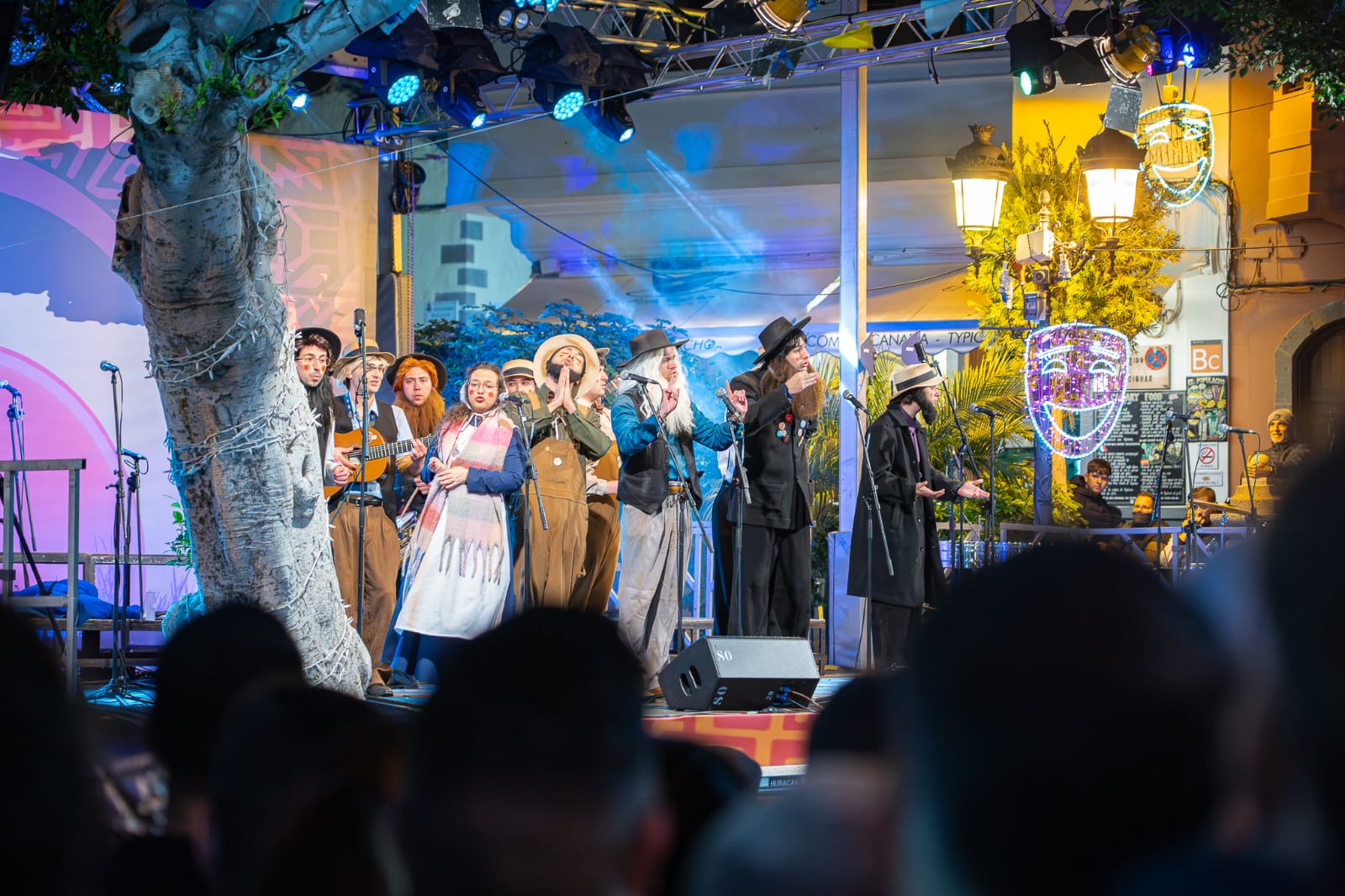 La plaza del Rosario vibra con el talento de la murga agüimense y el ingenio de la chirigota gaditana, en la primera jornada del Encuentro de Carnavales del Mundo.