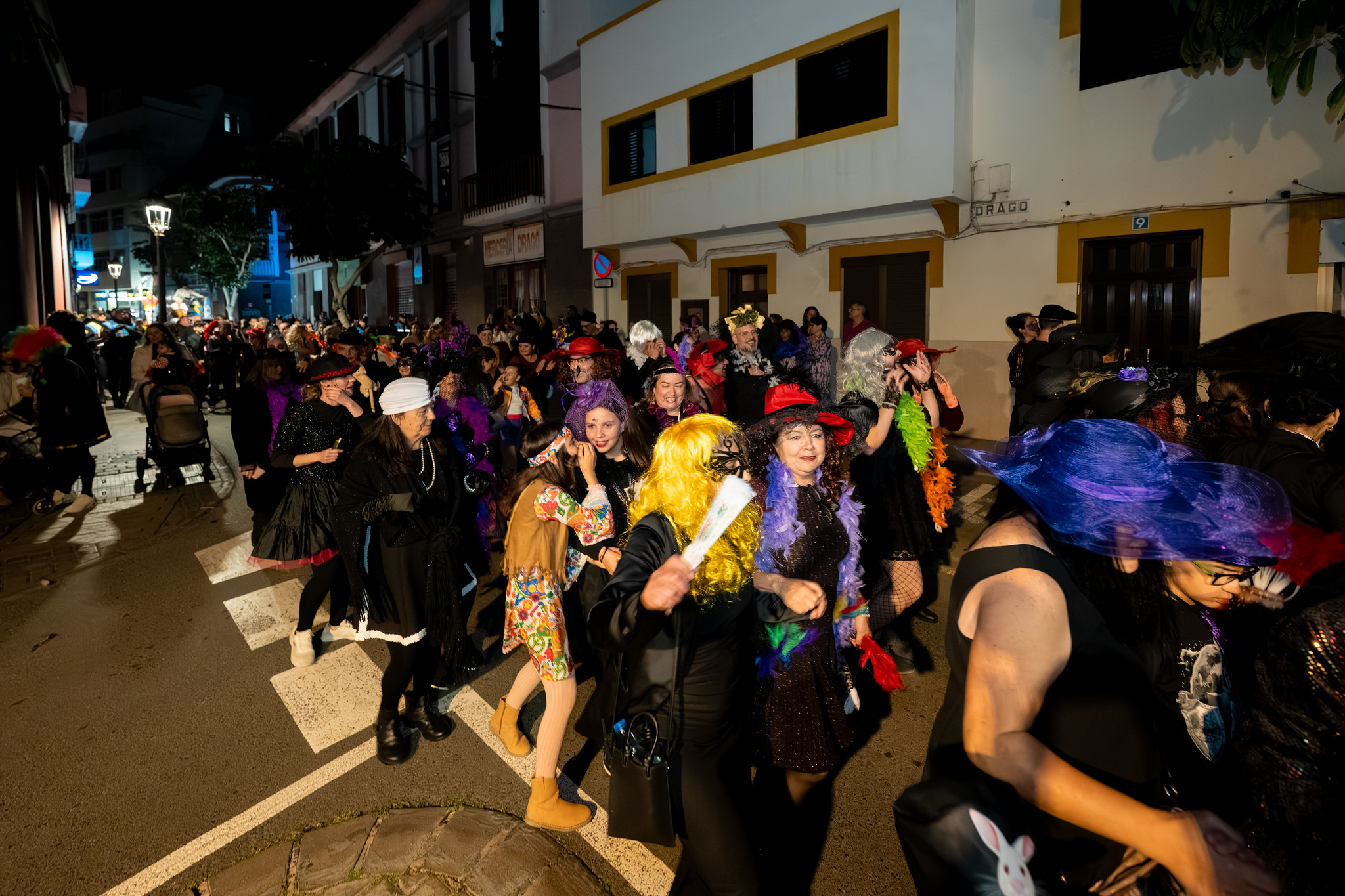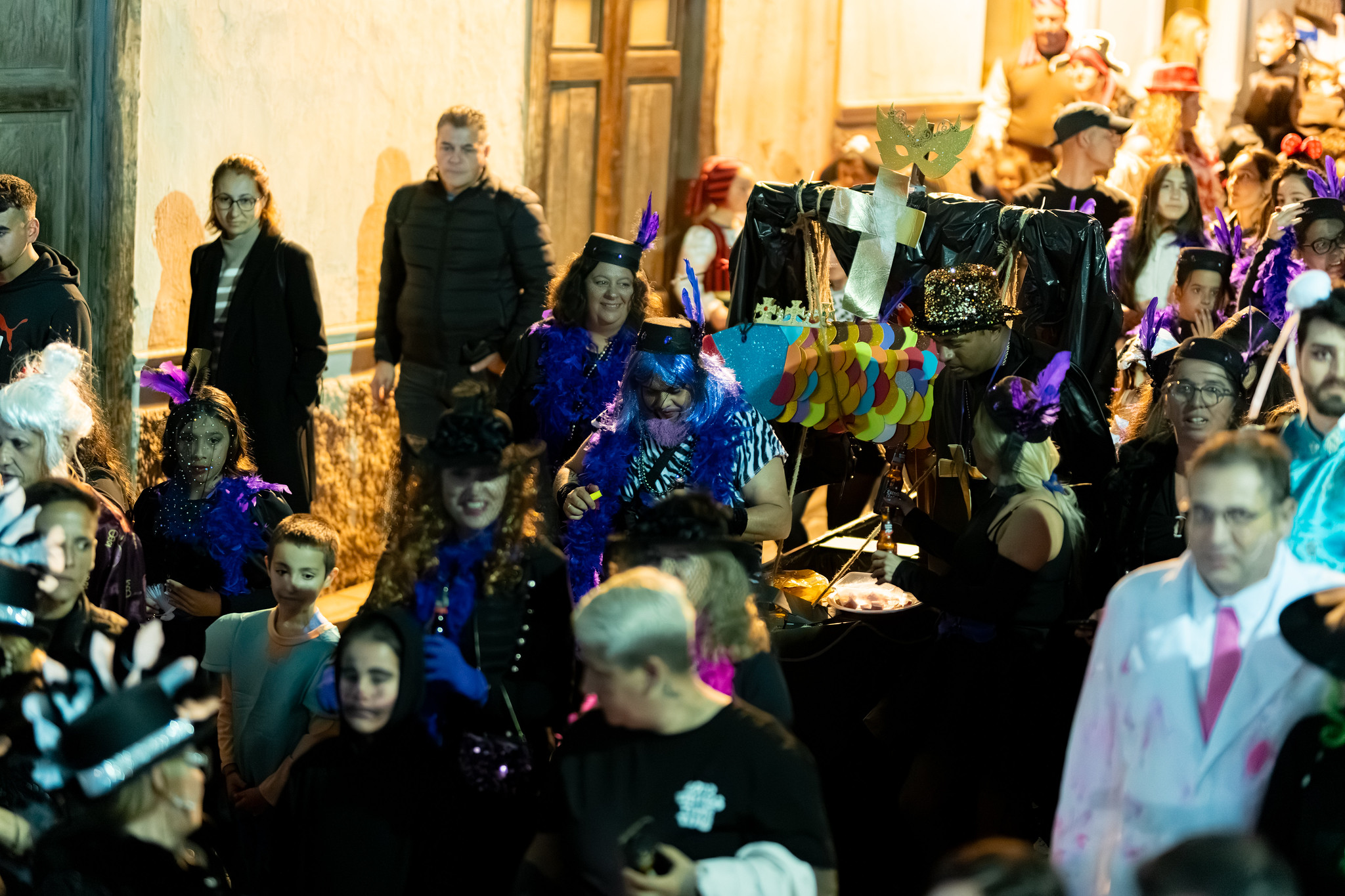 La comitiva de la Sardina, en la que no faltaron apenadas viudas vestidas de riguroso luto, obispos aplicando la extremaunción y piratas ataviados de negro de los pies a la cabeza partía desde el Polideportivo Municipal Juan Vega Mateos en dirección a la Plaza de Santiago, entre llantos y dramáticos suspiros, al ritmo de la Banda Guayedra, la Banda Archipiélago y DJ Promaster.
