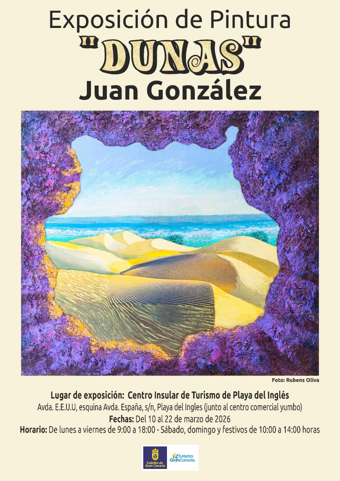 El pintor y escultor Juan González inaugura este 10 de marzo la exposición “Dunas”, una muestra que podrá visitarse hasta el 22 de marzo en el Centro Insular de Turismo de Playa del Inglés, donde el artista presenta una serie de obras inspiradas en uno de los paisajes más emblemáticos de Gran Canaria.