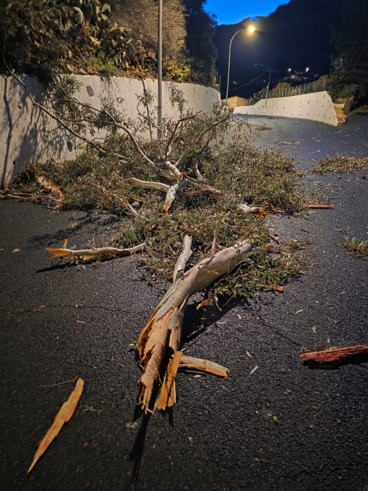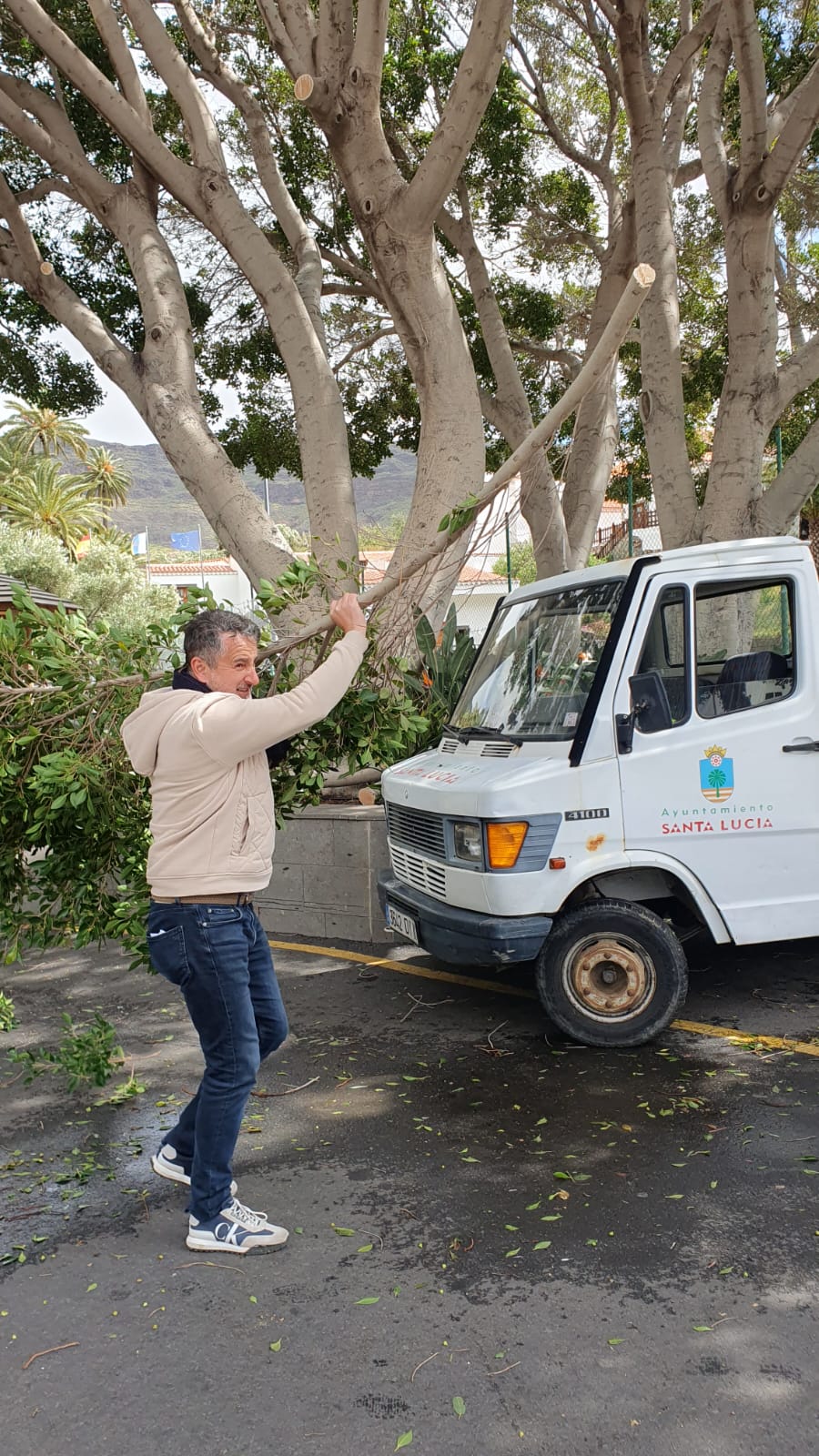 Santa Lucía de Tirajana, viernes 20 de marzo 2026.- El paso de la borrasca Therese por el municipio de Santa Lucía de Tirajana ha ocasionado una treintena de incidentes durante las primeras horas: caída de ramas y árboles de gran porte, el cierre de la carretera de acceso a Bahía de Formas o la delimitación de algunas calles por desprendimiento de cascotes debido a la intensa lluvia y viento. En el albergue instalado en Doctoral por el ayuntamiento durmieron la primera noche diez personas. A primera hora de la mañana de este viernes se cortó la carretera GC 65 que comunica la zona urbana con Santa Lucía casco para realizar tareas de limpieza y retirada de piedras que habían caído en la carretera.