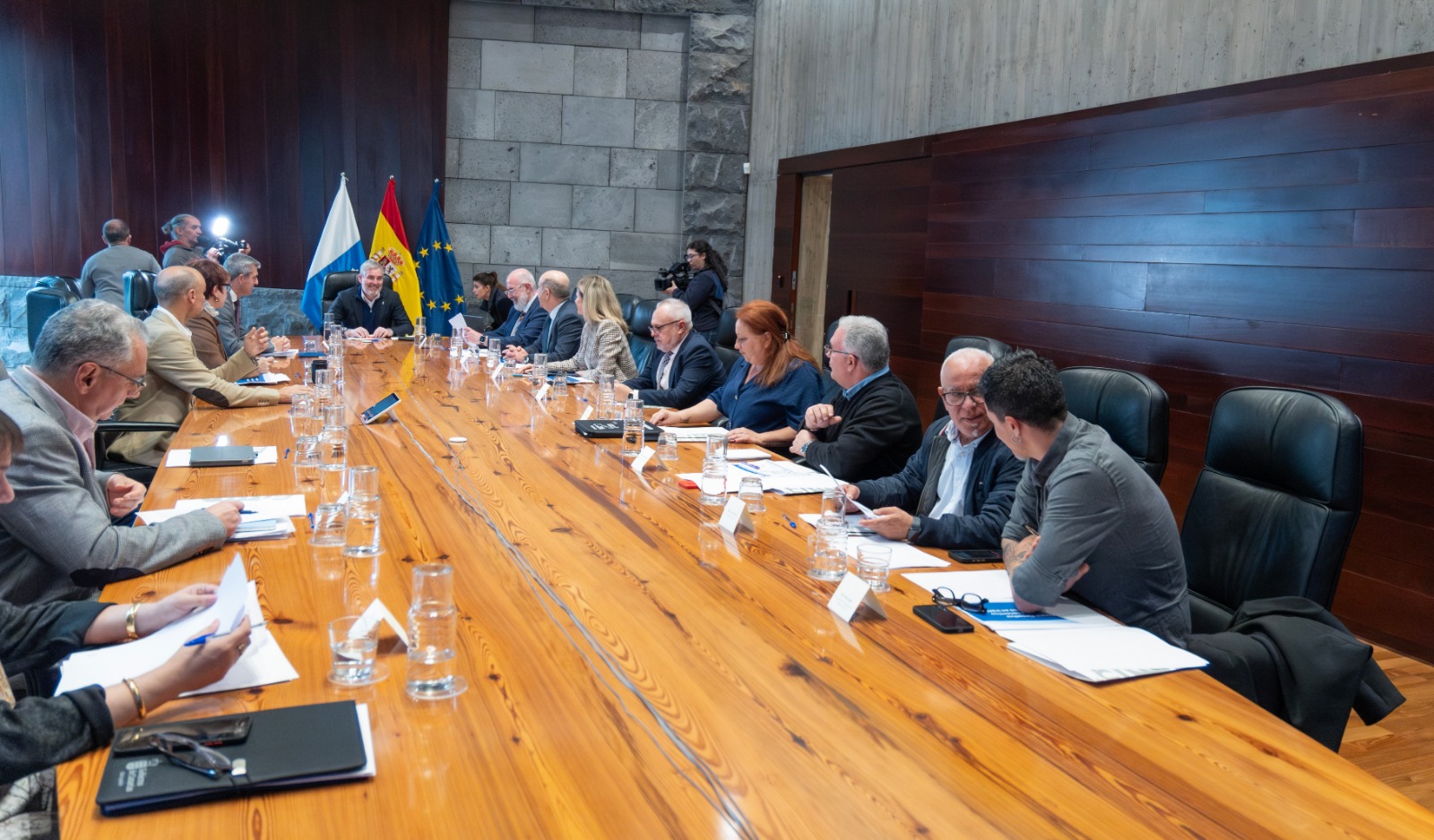 Junto a Clavijo y a Domínguez, han participado en la reunión en nombre del Gobierno la consejera de Bienestar Social, Igualdad, Juventud, Infancia y Familia, Candelaria Delgado; el consejero de Obras Públicas, vivienda y Movilidad, Pablo Rodríguez, el viceconsejero de la Presidencia, Alfonso Cabello; el viceconsejero de Hacienda, Gabriel Mejías; y el viceconsejero de Economía, Gustavo González.