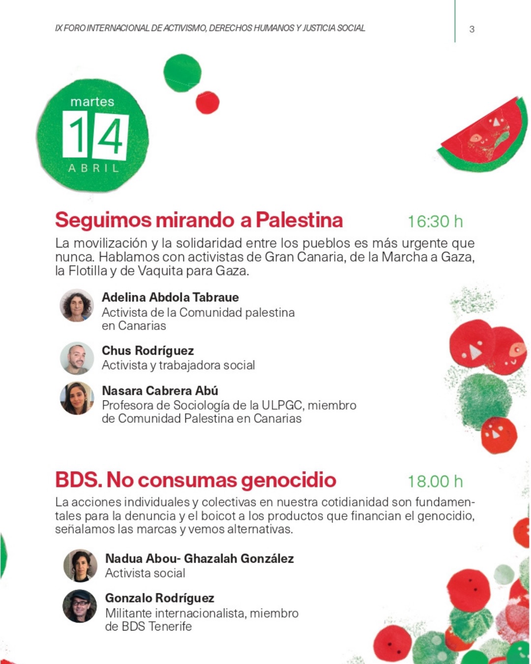 El martes 14 continúa el Foro de Activismo con dos mesas redondas, a las 16.30 ‘Seguimos mirando a Palestina’ con la activista de la comunidad palestina Adelina Abdola y el activista Chus Rodríguez, después a las 18 horas en ‘BDS.No consumas genocidio’ intervendrán la activista social Nadua Abou_Ghazalah González y el militante internacionalista Gonzalo Rodríguez. A las 19.30 la jornada finalizará con una mesa redonda sobre periodismo y ética periodística donde intervendrán la periodista visual hispano palestina Maysun, el director de documentales palestino Muat Hamed y la periodista canaria Gara Santana.