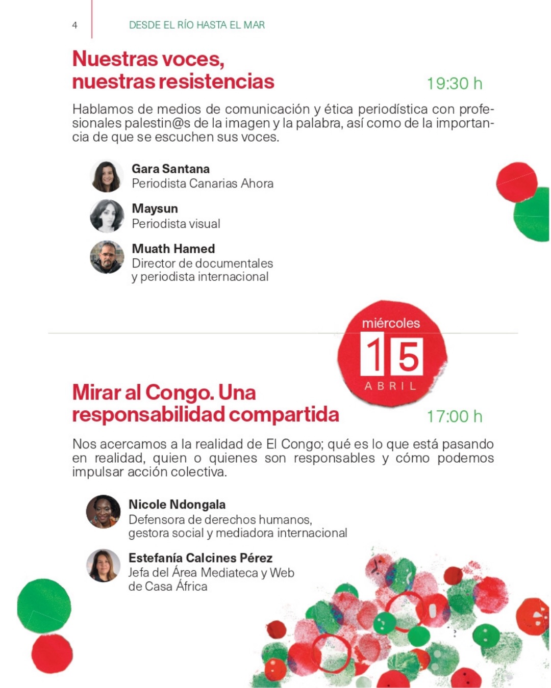 El miércoles 15 a las 17 horas la defensora de derechos humanos y mediadora internacional congoleña Nicole Ndongala y la responsable de la web de Casa África Estefanía Calcines tendrán el diálogo ‘Mirar al Congo. Una responsabilidad compartida’. A las 18.30 hablarán del uso del territorio y del derecho al techo en la mesa redonda ‘Quieren el barrio mío y que abuelita se vaya’ la activista antirracista Melinda Gladys Pajunen, el activista social y ecologista Víctor Suárez y el militante del sindicalismo de vivienda Johathan Mesa.