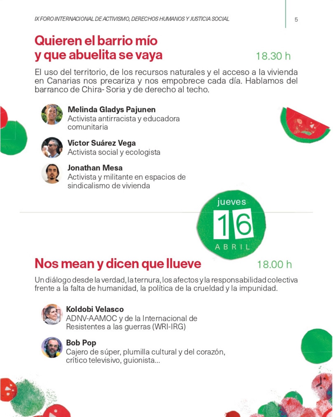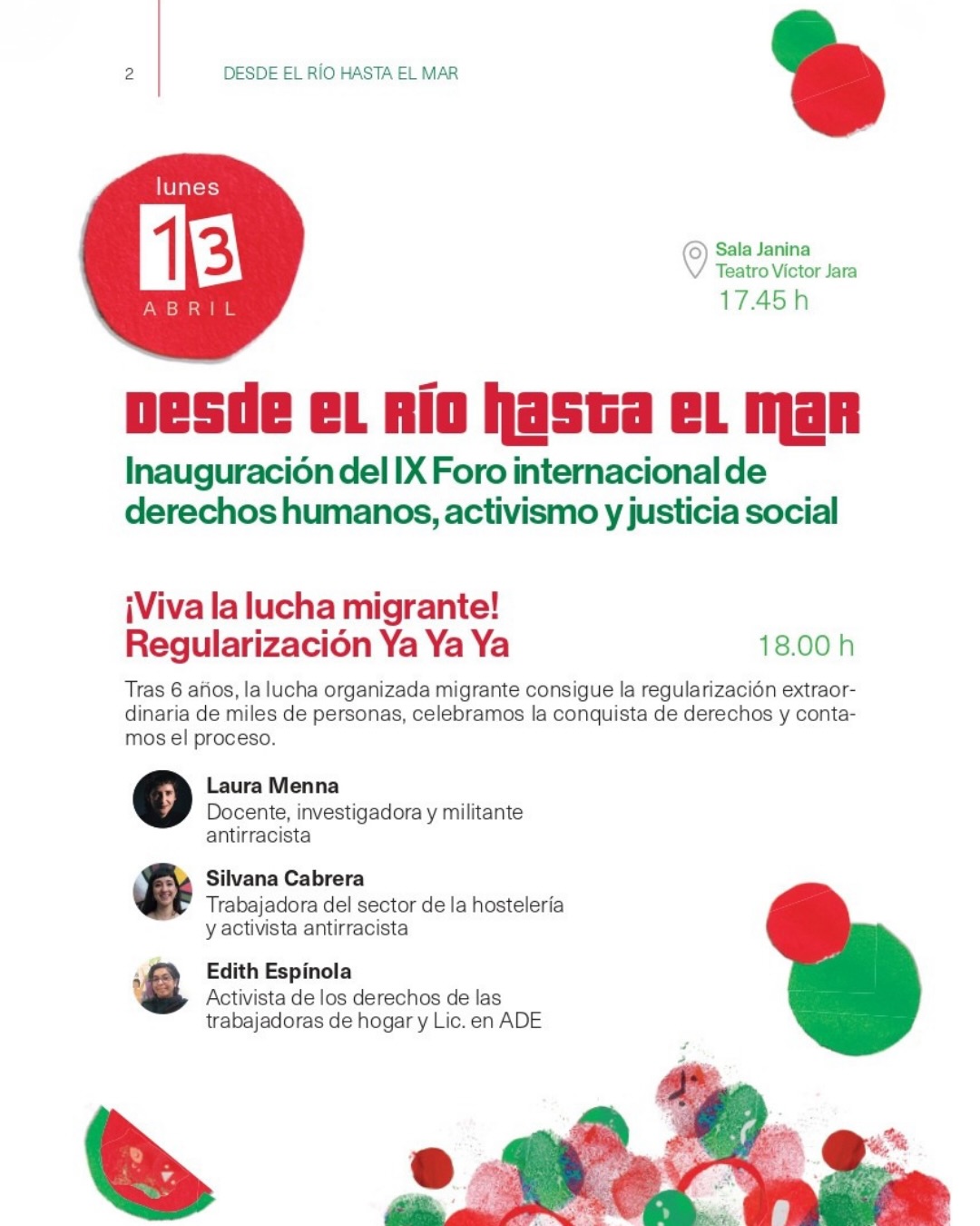 Santa Lucía de Tirajana, lunes 13 de abril 2026.-  El IX Foro Internacional de Activismo, Derechos Humanos y Justicia Social se inaugura la tarde de este lunes con la mesa redonda ‘Viva la lucha migrante! Regularización ya,ya,ya’ a partir de las 18 horas. El Foro del ESPAL (Encuentro de Solidaridad con los Pueblos de África y Latinoamérica) continuará en la sala Janina del teatro Víctor Jara hasta el próximo jueves. Durante cuatro días se hablará de Palestina, el Sáhara, el derecho al techo, los medios de comunicación y el activismo social . El jueves a las 18 horas se clausurará el Foro con un diálogo entre el guionista y crítico televisivo, Bop Pop y la activista social y antimilitarista Koldobi Velasco.