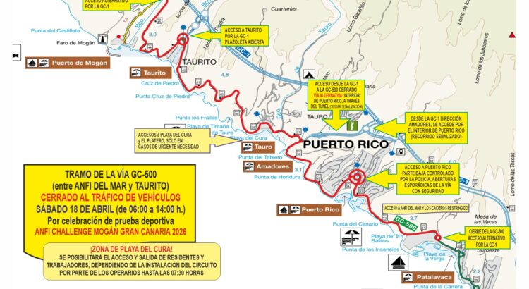 Los cortes y restricciones se producirán aproximadamente entre las 06:00 y las 14:00 horas del sábado 18 de abril con motivo de la celebración de la décima edición de la prueba de triatlón Anfi Challenge Mogán Gran Canaria. La carretera GC-500 se encontrará cerrada al tráfico de vehículos entre la plazoleta del barranco de La Verga –Zona de Anfi del Mar, punto kilométrico 30+700– y el barranco de Taurito, punto kilométrico 42+800.
