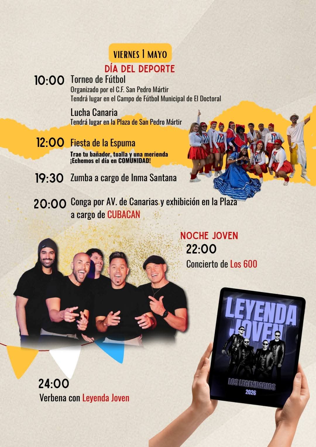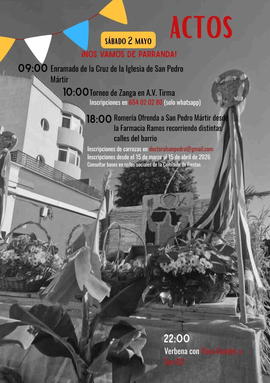 Santa Lucía de Tirajana, lunes 27 de abril  2026.-  El Doctoral celebra desde este lunes 27 hasta el 3 de mayo las fiestas en honor a San Pedro Mártir.  La Comisión de Fiestas El Doctoral-San Pedro Mártir ha preparado un programa de actos muy variado y dirigido a todos los públicos. Actividades infantiles, parrandas, romería, fiesta del agua o torneo de zanga forman parte del programa realizado por la Comisión de Fiestas con el apoyo del Ayuntamiento de Santa Lucía de Tirajana.